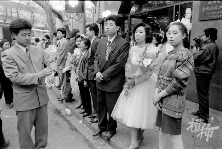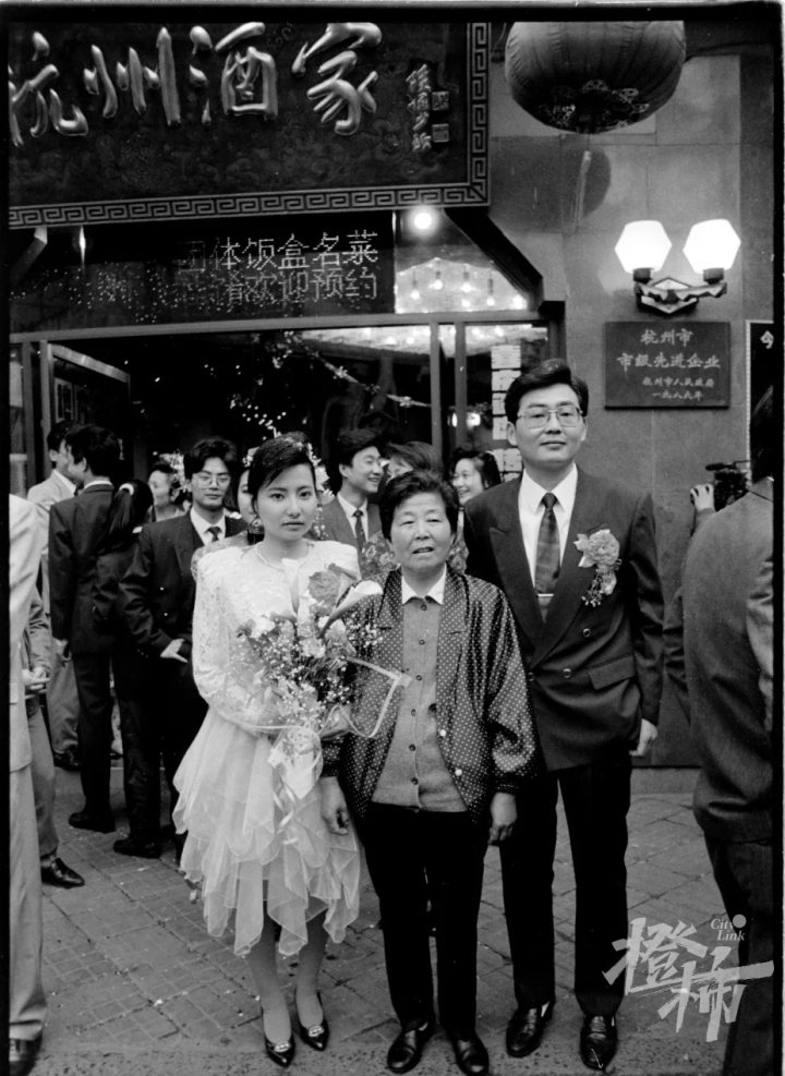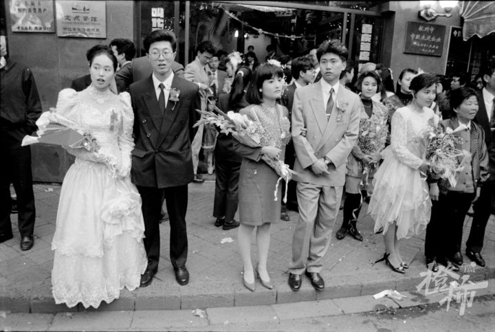 一组摄于1990年左右的照片中,一天中至少有三对新人在杭州酒家举办婚礼,有伴郎模样的人着急地查看手表时间。