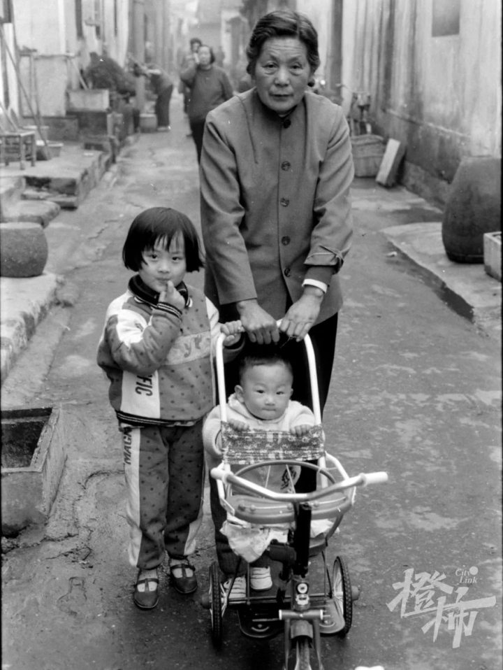 照片中,一个老奶奶推着摇篮车,带着一对憨态可掬的孙辈,缓缓移步在杭州的一条老街巷了,周围陈设有很遥远的年代感……