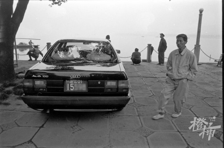当年,车子是可以开到湖边上欣赏风景,而奥迪车,在当年的杭州还是比较稀少的。
