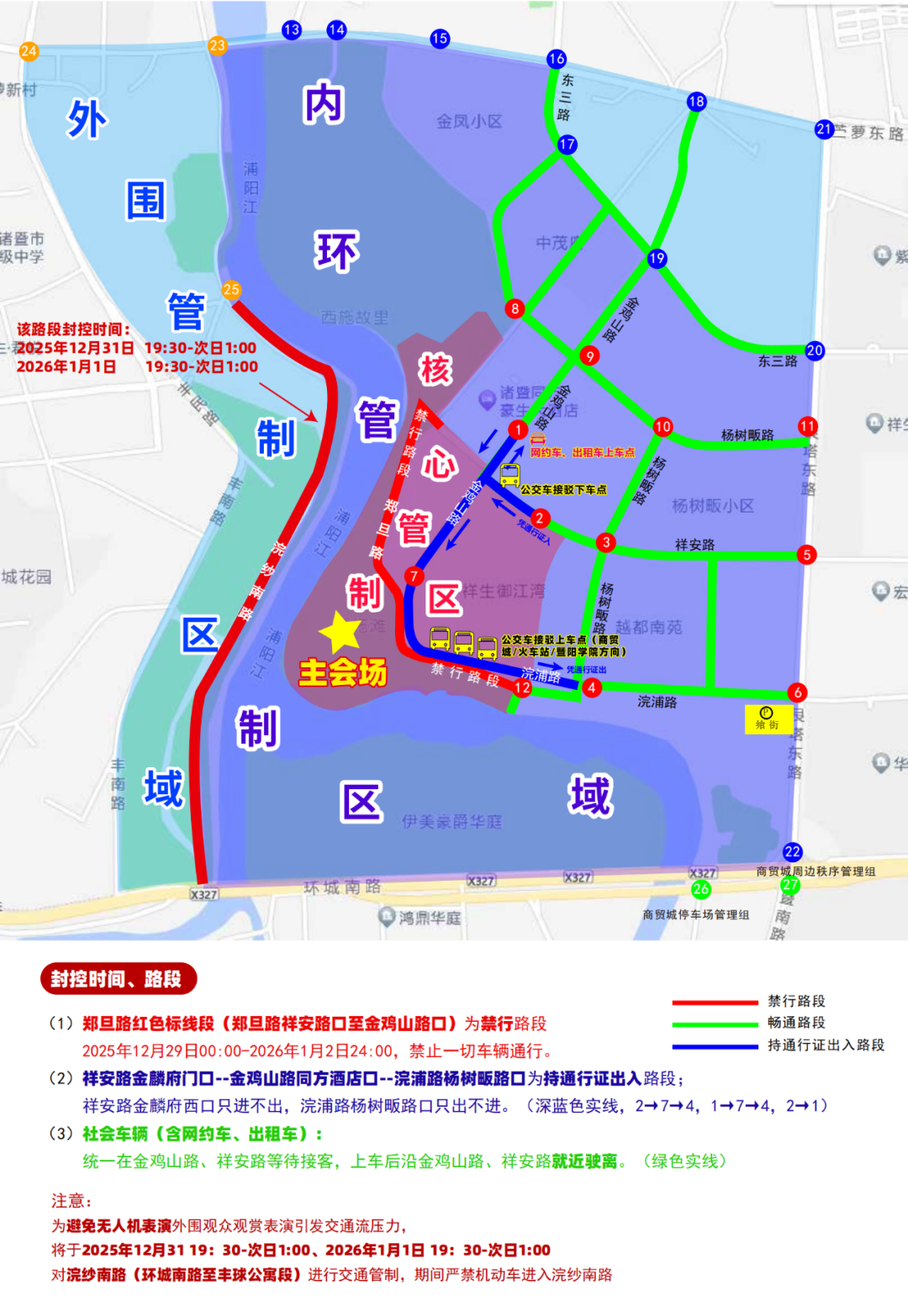 核心管制区域(围绕西施滩设置):金鸡山路(含)—祥安路(含)—杨树畈路(不含)—浣浦路(含)合围区域。管制时间:2025年12月31日(9:00—次日01:30)2026年1月1日(9:00—次日01:00)