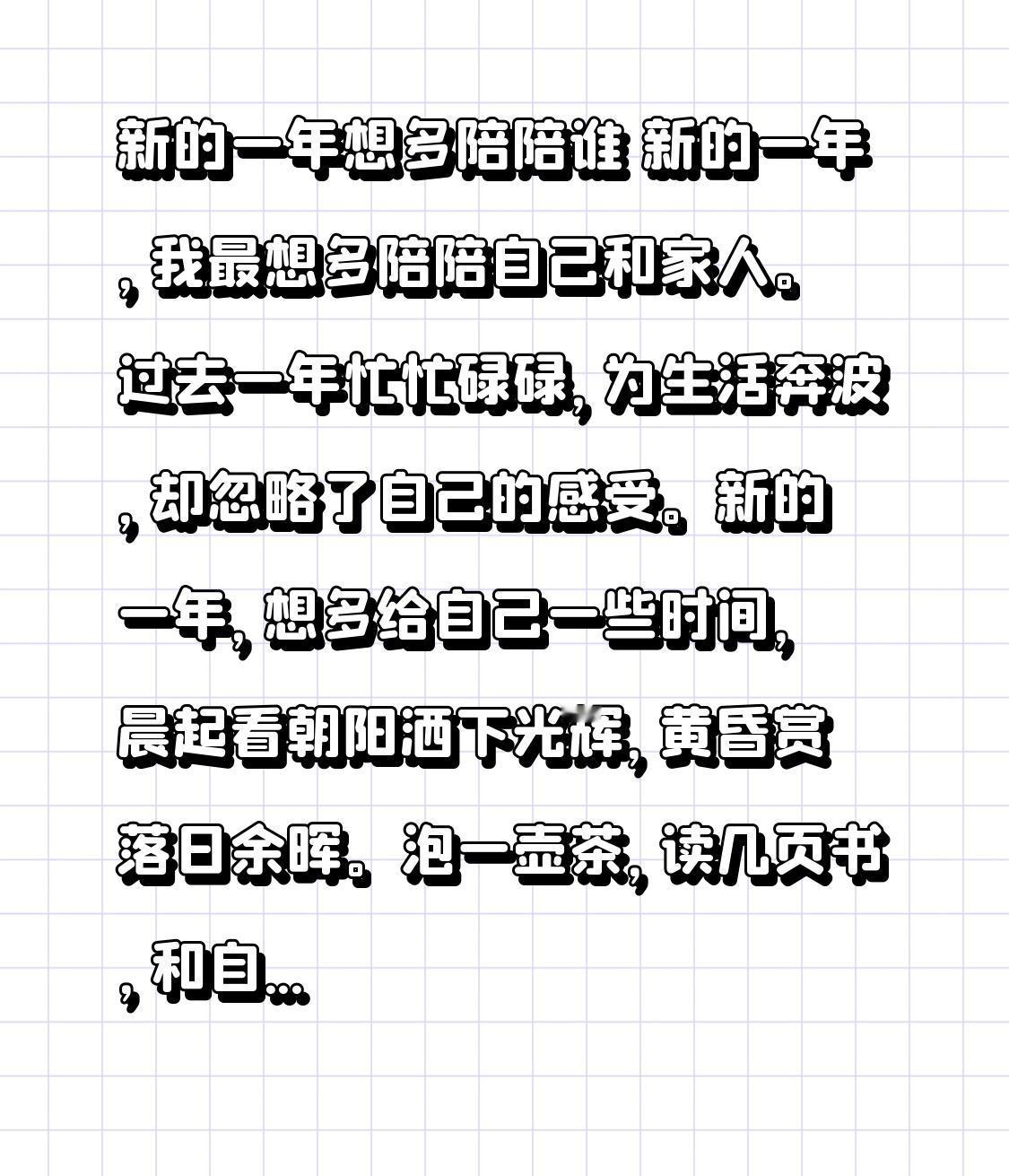 新的一年想多陪陪谁 新的一年,我最想多陪陪自己和家人。 过去一年忙忙碌碌,为生活奔波,却忽略了自己的感受。新的一年,想多给自己一些时间,晨起看朝阳洒下光辉,黄昏赏落日余晖。泡一壶茶,读几页书,和自己好好对话,接纳不完美的自己。 岁月匆匆,父母日渐苍老。以前总觉得尽孝来日方长,现在明白要珍惜当下,多回家陪他们吃顿饭、唠唠嗑。还有爱人与孩子,少刷手机,多陪爱人散步,听孩子分享校园趣事。只有先照顾好自己,才能更好地守护家人。