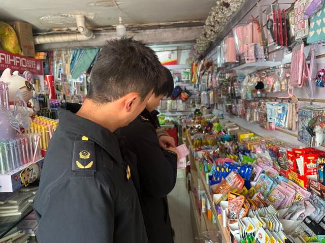 在一所小学旁的文具店内,西宁市城东区市场监督管理局执法人员查验玩具货架,排查无3C认证、存在安全隐患的儿童玩具,逐一翻阅儿童读物,严查含暴力、迷信等有害内容的违规读物,细致核对文具造型与标识,杜绝不良导向商品。
