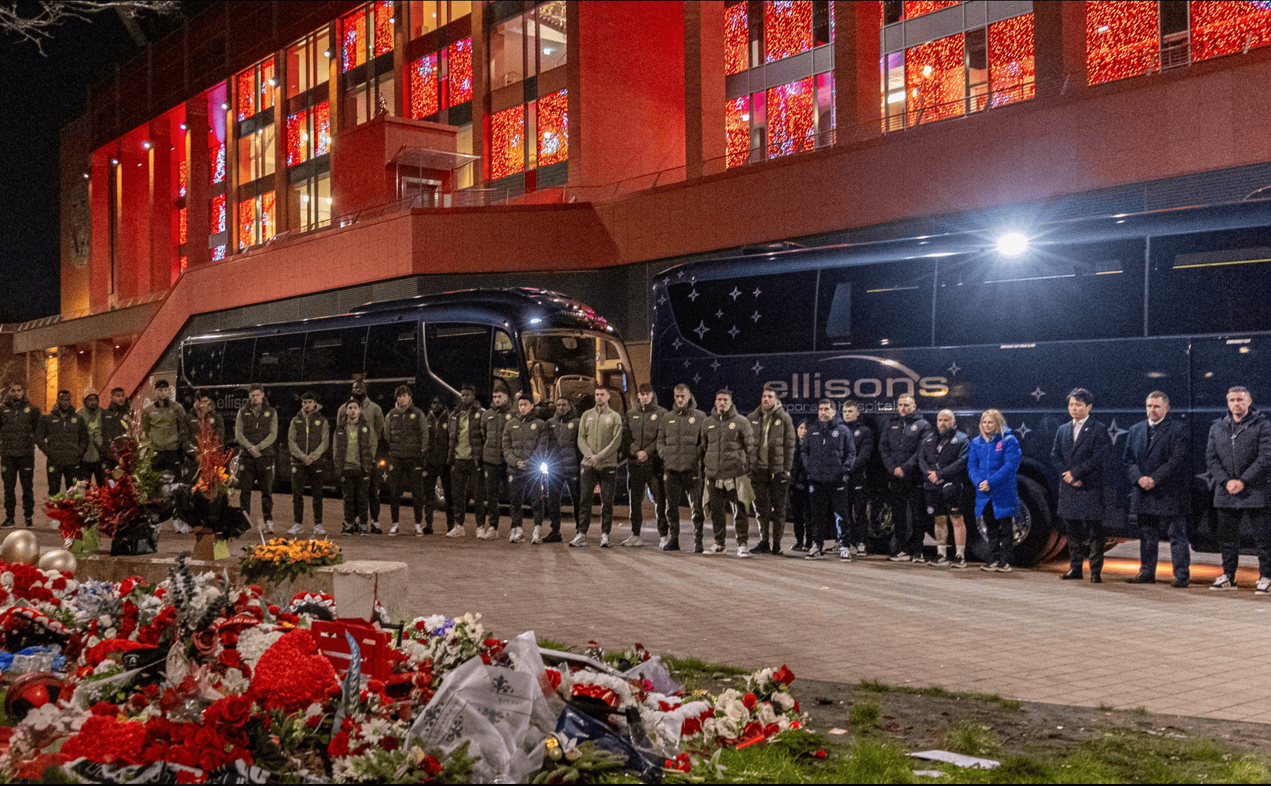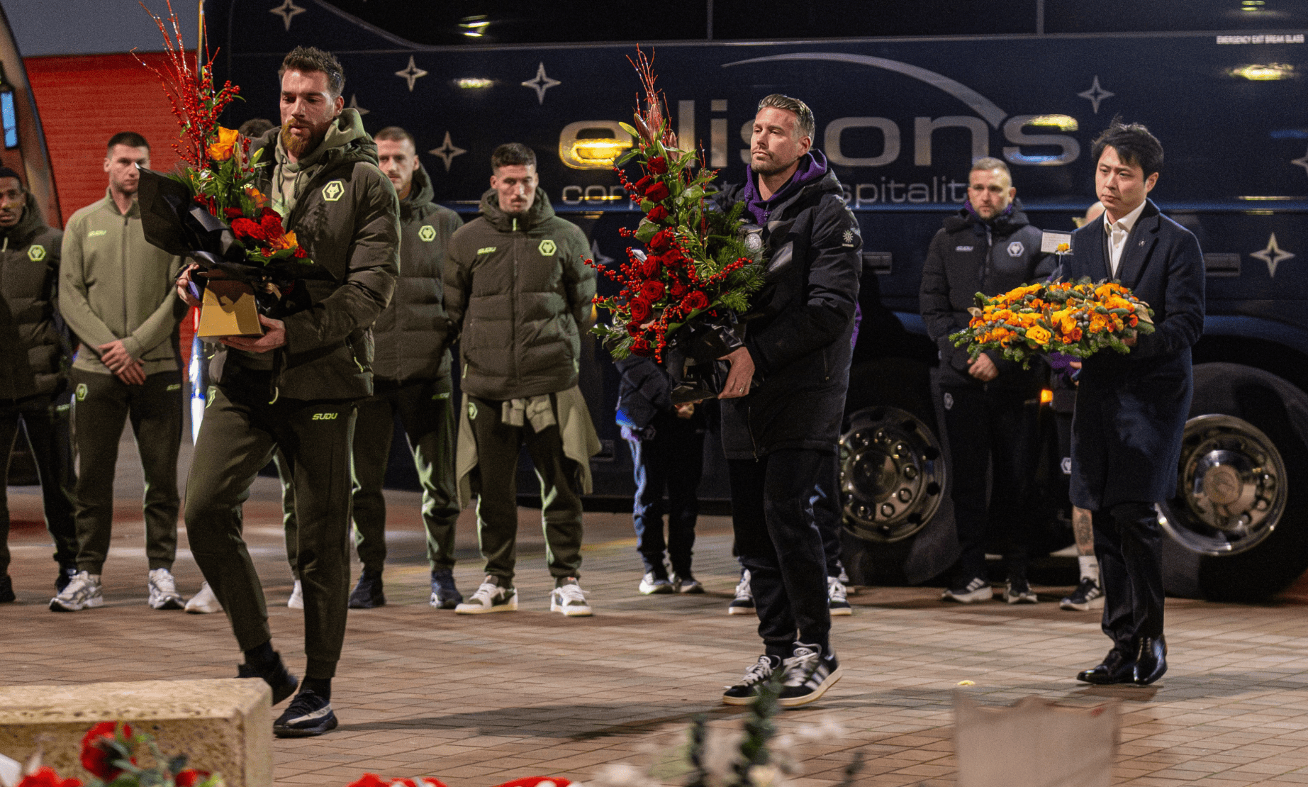 虎扑12月27日讯北京时间今晚23:00,狼队即将前往客场迎战利物浦。赛前,狼队全队前往安菲尔德悼念了今年夏天不幸去世的若塔。