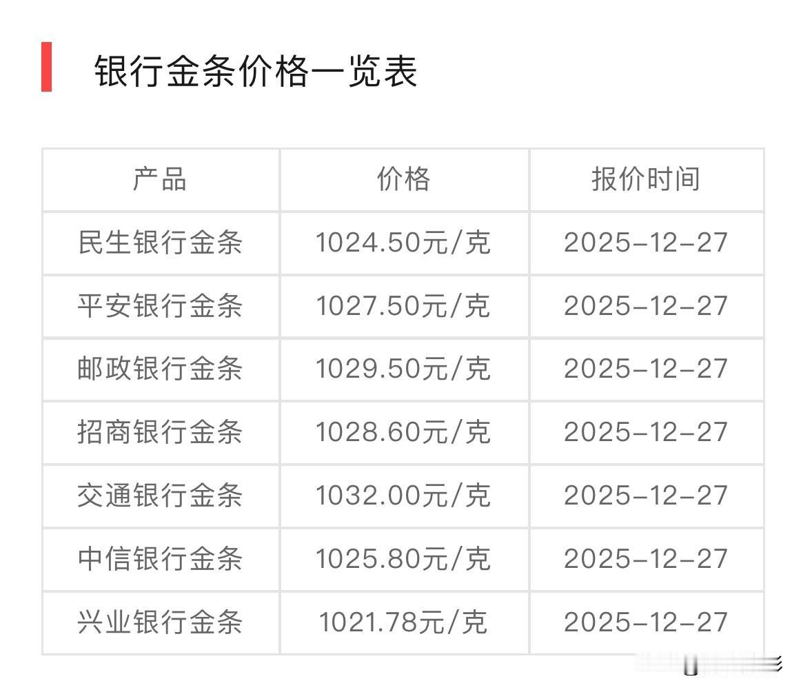 最新消息! 各大银行金条价格同比昨天又上涨了,现在来看看金条卖多少钱一克了? 农业银行金条1038.15元/克, 工商银行金条1029.05元/克, 建设银行金条1027.00元/克, 邮政银行金条1029.50元/克。 与昨天相比各大银行金条普遍又上涨了,农业银行价格上涨7.75元/克,工商银行金条价格上涨了4.36元/克,建设银行金条上涨了9.5元/克,邮政银行金条价格上涨了8.5元/克。 与其各大银行金条价格基本保持在1021.78元/克-1038.15元/克区间。 所有信息,都只是提供参考价值! 购买黄金有风险,请大家保持理性购买!