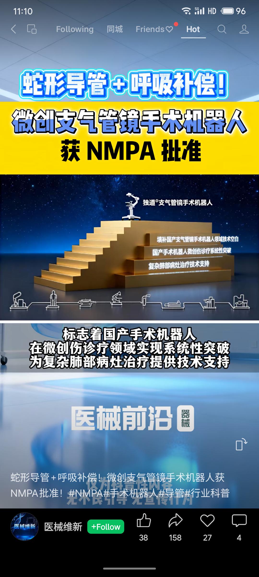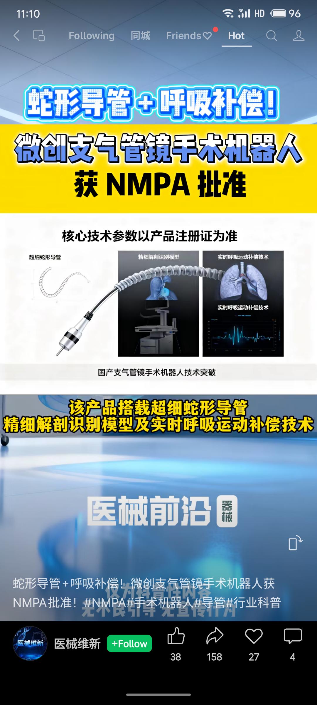 微创®机器人旗下“独道®”支气管镜手术机器人获国家药监局(NMPA)上市批准。其蛇形导管与呼吸补偿技术,填补了该领域国产空白,实现了在复杂肺部病灶微创诊疗上的系统性突破,标志着国产高端医疗设备发展再进一步。