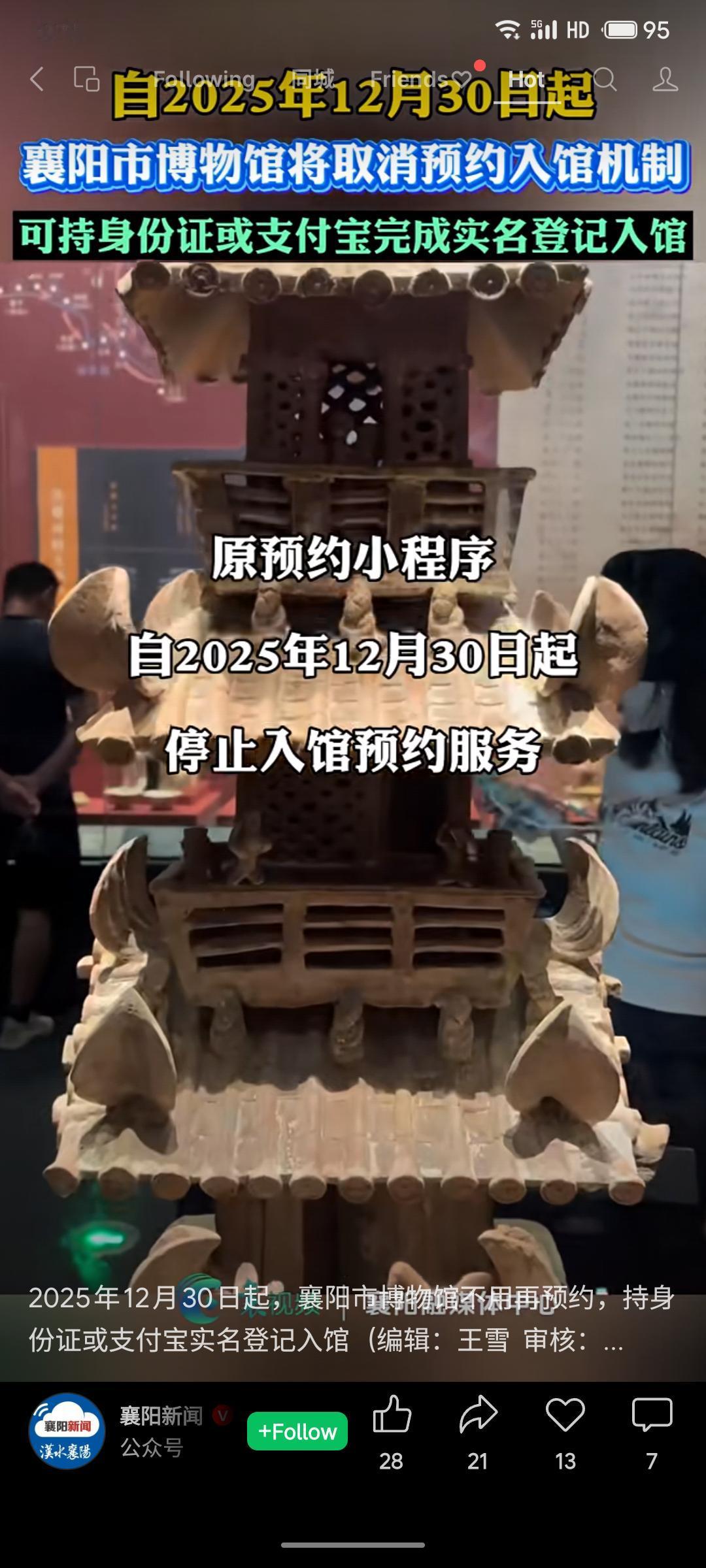 自2025年12月30日起,襄阳市博物馆取消预约入馆,观众持身份证或支付宝即可实