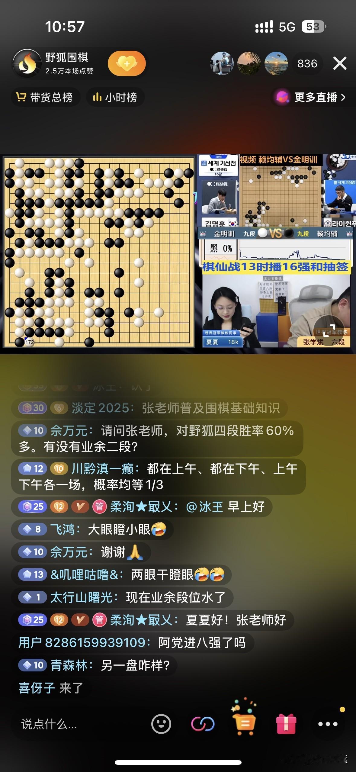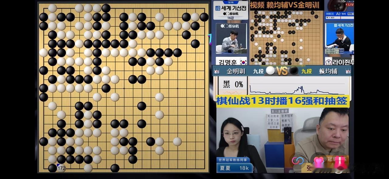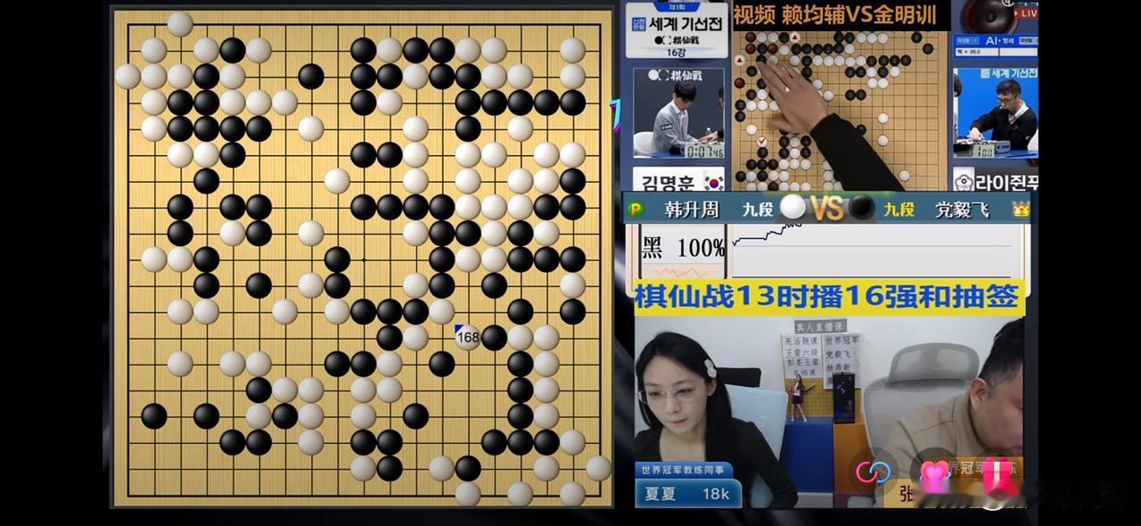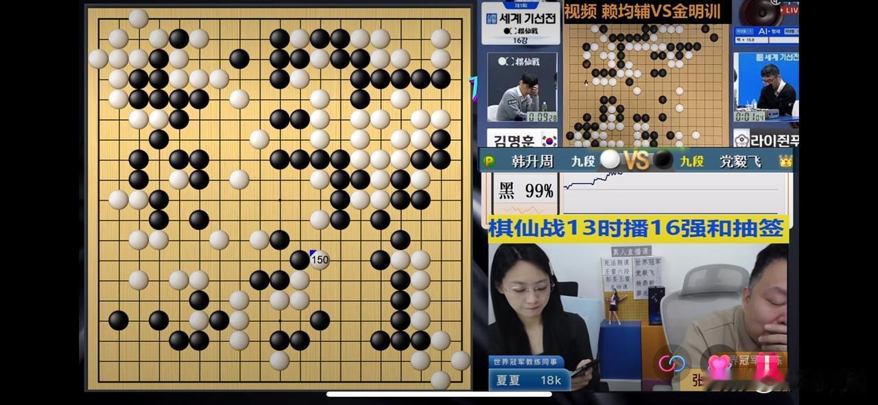 恭喜🎉🎉静静战胜韩升周晋级棋仙战八强!赖均辅不敌金明训无缘八强[呲牙][捂脸] 首届世界棋仙战1/8决赛中午两场比赛有了最新动态:在首轮比赛里,中国队9人出战5人晋级,党毅飞和赖均辅都顺利跻身16强。这次1/8决赛,党毅飞对阵韩国的韩升周,从当前情况看他晋级无虞,实力确实不容小觑。此前32强赛,他完胜日本名将村川大介,展现出强大的竞技状态。 赖均辅对阵韩国的金明训,形势就比较严峻了。棋场如战场,局势瞬息万变,后续比赛还不知会有怎样的反转,期待他们接下来的表现。 围棋界爆冷 韩国棋仙战