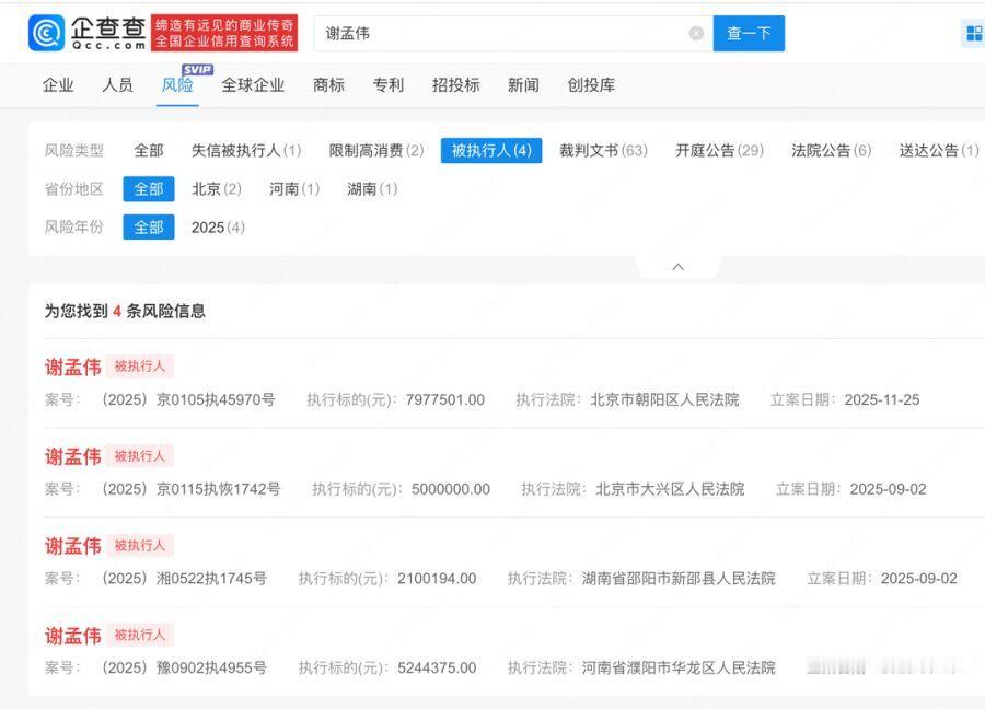 “嘎子哥”谢孟伟成老赖这事,真的让人惊掉下巴。天眼查显示,他因有能力却拒不履行169万案款,被列为失信被执行人,这履行情况还是全部未履行。截至今年5月29日,他就欠着本金166.6万、利息3.1万余元呢。 其实他之前就有不少执行案。11月,他和妻子新增约797.75万元执行标的;10月,被多地法院执行超千万;之前还被河南省濮阳市华龙区人民法院执行约524万元。再加上之前穿警服带货被拘7日,这“嘎子哥”形象算是彻底崩塌了,真是让人唏嘘。