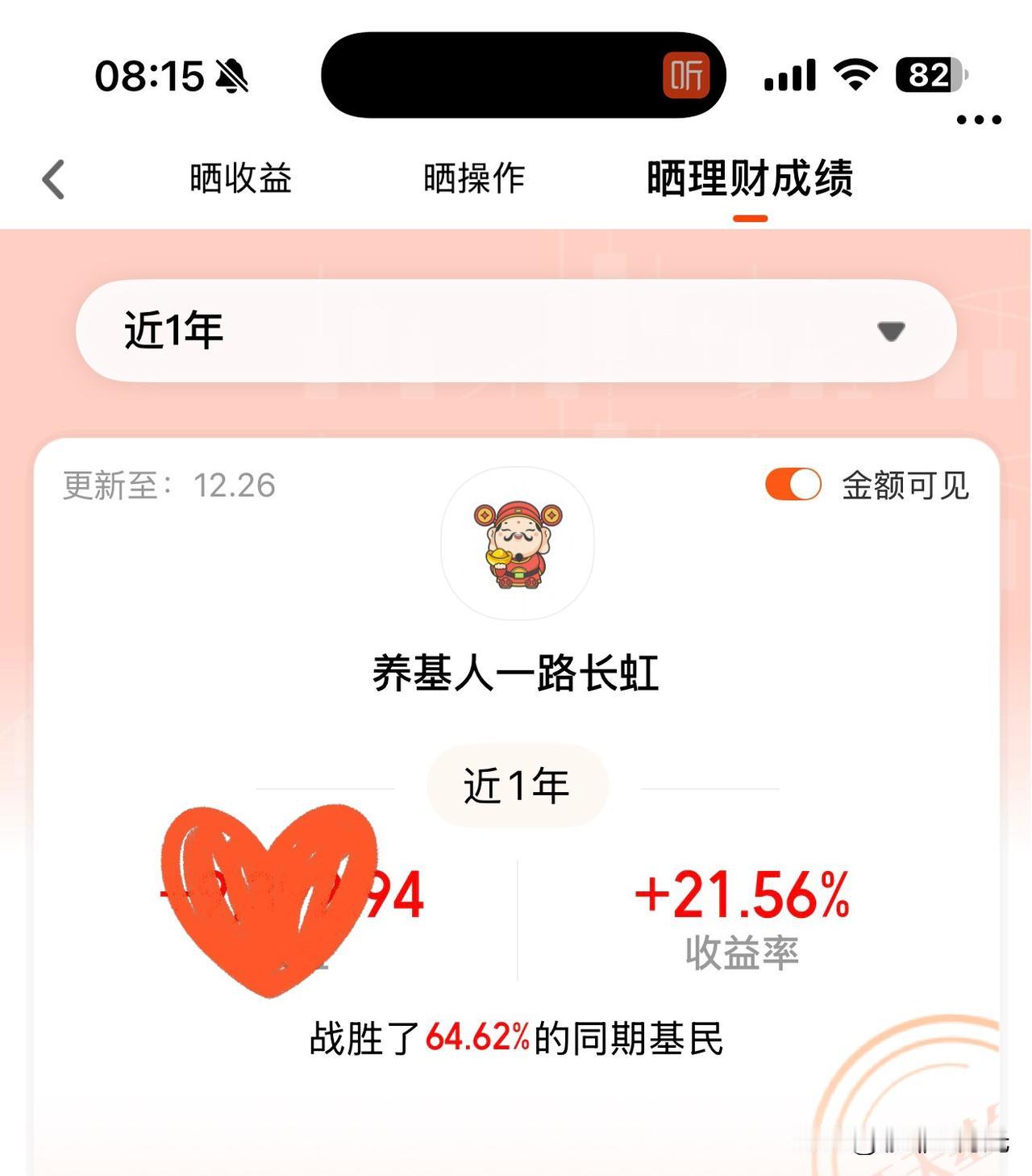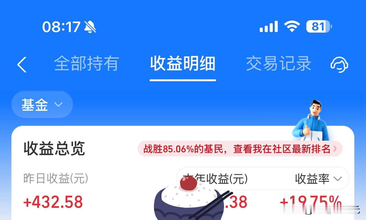 还有三个交易日 周末闲暇,查看了自己的理财账户 有我的账户,还有给女儿准备的嫁妆基金 另外还有银行大额存款及理财产品 四个平台的总收益+17W左右 理财账户里股票表现最差,看来我还是不擅长买股,白白浪费了资金 明年我还是继续投基金吧,这个我比较能把握[捂脸] 女儿的嫁妆基金收益率最为可观,不过都是用压岁钱投的,资金量有点少。过年时多给她点压岁钱,明年就能增加投资了[捂脸] 普通人理财,不能急躁,也不能贪婪 首要的是追求稳健,其次要保持良好心态 此等既不耽误我喝茶学习,又不影响我游览山河的方式,很适合我[捂脸] 比上不足,比下有余 如此便足矣 [祝福][灵光一闪][招财进宝][红包来啦][红包]
