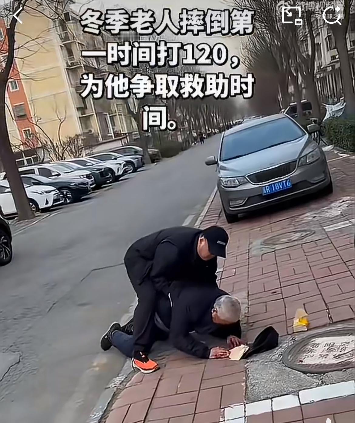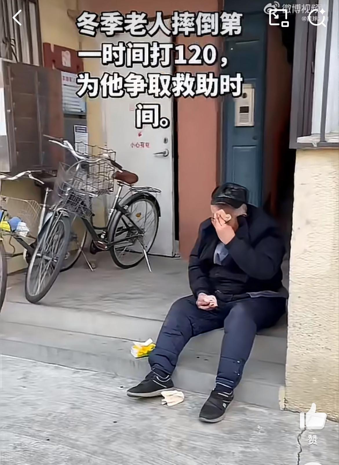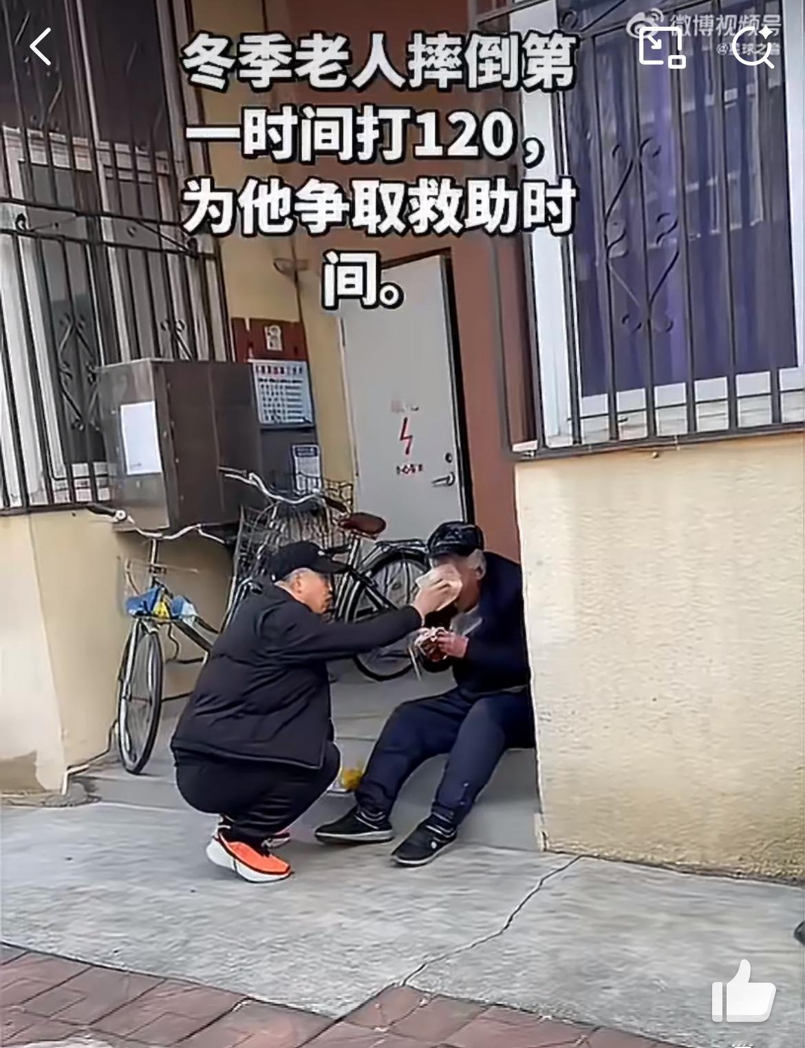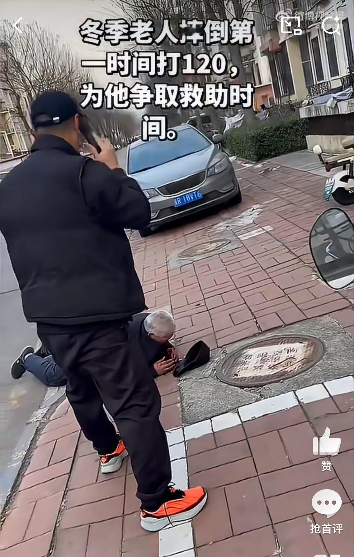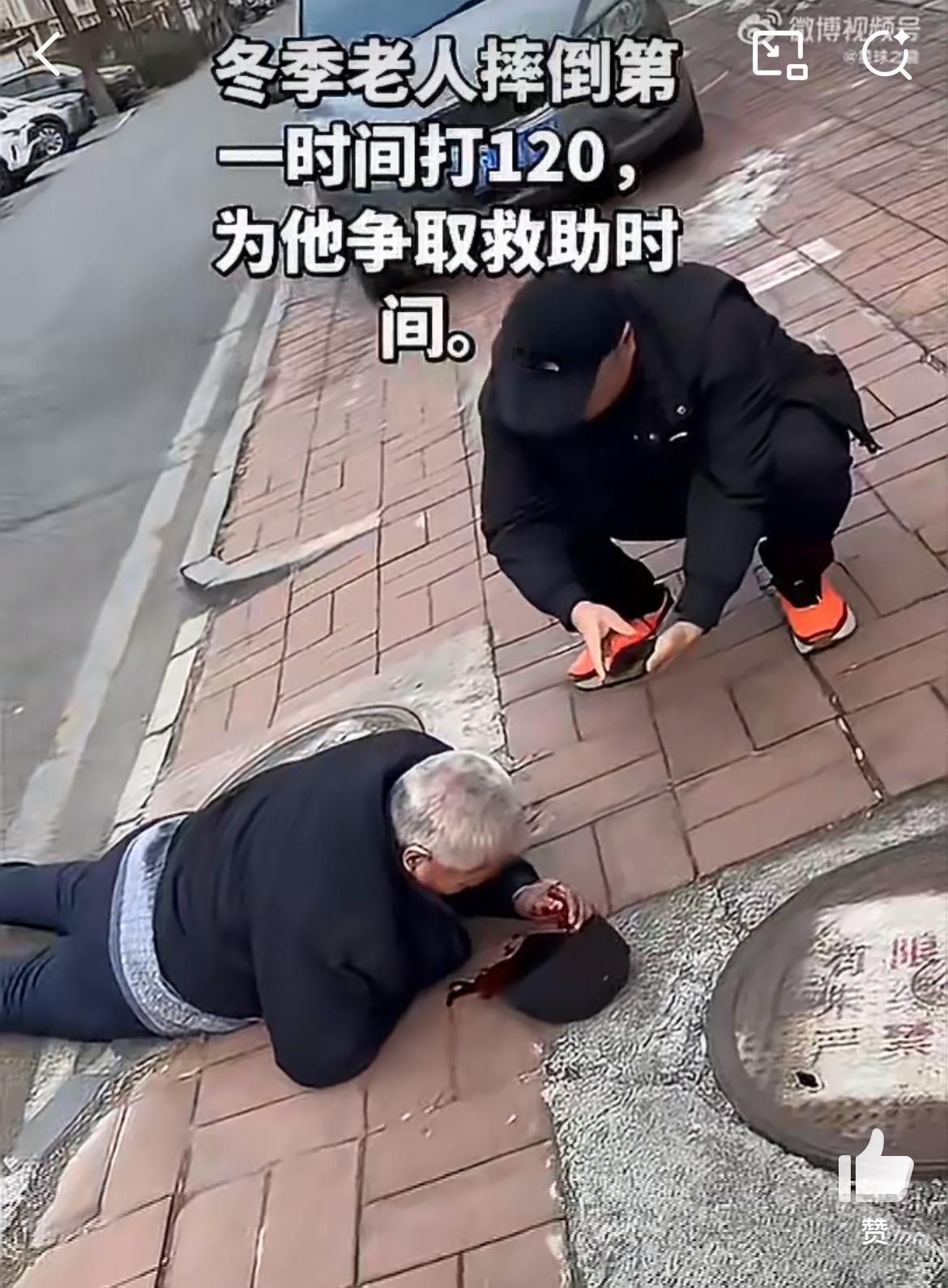 马路上看到一老人扑倒,一个热心大哥过去帮忙,问老人是哪里的,老人说不清楚,给他打了个120。在等待救援的过程中,为了老人的安全,大哥把手机摄像头打开让旁边人拍摄,他把老人扶起来,送到路边的台阶上坐着,给他擦拭额头流血的伤口,还有一个热心的老太来帮忙。摔倒老人