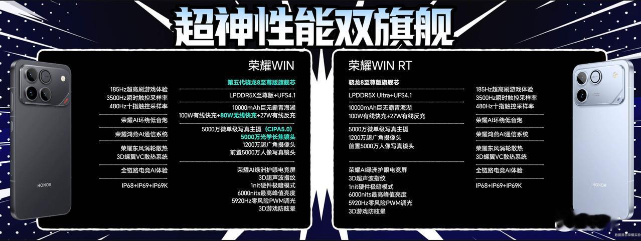 荣耀WIN系列这是要和REDMI K90中门对狙?价格都一模一样!但我依然只推荐WIN RT,WIN可以直接推沟里了。 荣耀WIN系列在发布前各种火力全开,又是从GT改名WIN又是各种WIN赢宣发,一副“誓要把我失去的夺回来”的样子。很多网友都在猜测,荣耀WIN搞这么大阵仗,是不是要成为最便宜的骁龙8Elite Gen5机型?结果还是一样,卡在了3999,根本绕不过去这个坎。 荣耀WIN: 12+256G 3999、12+512G 4499(首销4399)、16+512G 4799(首销4699)、16+1T 5299(首销5199) 荣耀 WIN RT:12+256G 2699(首销2599)、12+512G 3099、16+256G 2999(首销2899)、16+512G 3399、16+1T 3999 总的来说,荣耀WIN除了标准版最低配的256G外,其余版本首销期间都有100的优惠;而WIN RT则反过来了,是两个256G的低配版本首销期间优惠100。 2699和3999的起售价正好跟REDMI K90系列一毛一样,WIN相比WIN RT,也就多了一个80W无线快充、多了个长焦镜头、然后主摄防抖提升到CIPA5.0,最大的升级就是把处理器从骁龙8Elite提升到骁龙8Elite Gen5,其余部分几乎一模一样,完全没有一点诚意(看看REDMI K90 ProMax又是加大使用小米17PM同款屏幕,又是狠狠提升影像,又是和BOSE合作加了一个低音单元,就这样都被很多人批红米飘了,荣耀WIN这个看起来更没有诚意)真的可以推沟里了,4000元价位段可选择的太多了,多的不说,自家旗舰荣耀Magic 8不比这香? 当然,可能很多人会说,这是游戏手机,有独立风扇,那我的建议是买荣耀WIN RT,它也带风扇,骁龙8Elite和骁龙8Elite Gen5性能差距并不大。一样有10000毫安大电池,屏幕也是同款,支持185Hz超高刷、6000尼特的峰值亮度,除了处理器差那么一丢丢,其余配置一样,所以预算不多且喜欢玩游戏的,那WIN RT明显更值得入手。 并且我一直好奇,这个风扇转起来的时候不觉得吵么?时间久了会不会积灰,既然手机支持防尘防水(支持IP68/IP69/IP69K),那我可以直接用水冲洗手机冲洗风扇么?如果冲洗风扇手机坏了也跟其他家宣传的进水不保修,那还是老老实实买个手机散热背夹吧,也就热天的时候有用,冬天这个气温玩游戏手机散热根本就没压力。 另外,我没理解,为啥标准版是WIN RT,而高配版是WIN(高配版字幕更少,这跟目前主流的做法相悖),这个RT是啥意思?那怕是用之前的GT也比RT好听吧?