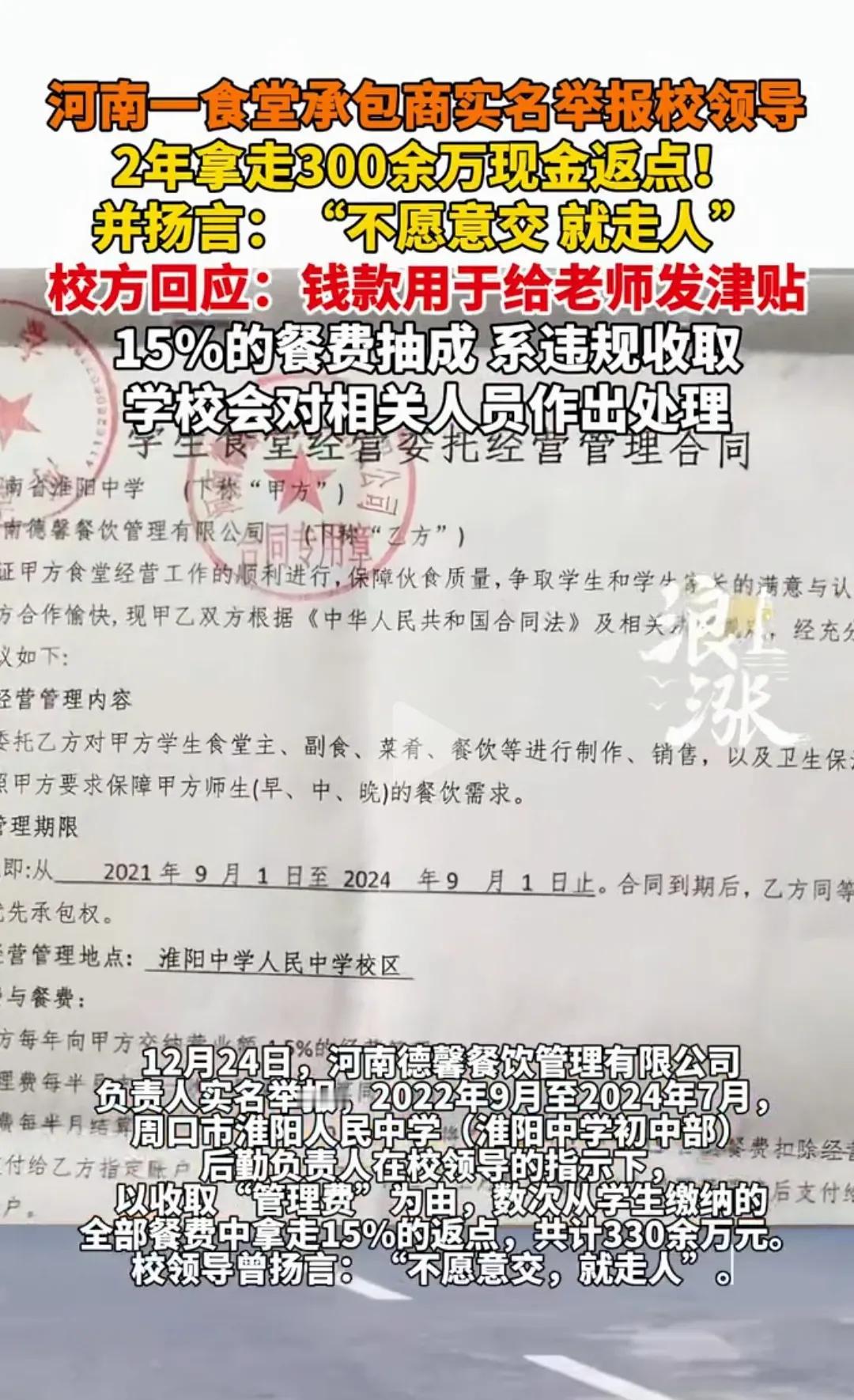 330多万! 河南这所学校的操作太黑心了! 3000名学生每天20元餐费,本是保障孩子三餐的活命钱,校领导却撕毁合同,把管理费从4.5%飙到15%,两年狂抽330多万返点,简直把学生食堂当成了摇钱树! 别拿“给老师发津贴”当遮羞布,这根本就是啃食孩子健康的“蝇贪蚁腐”!国家早明确学生食堂要“非营利”,食材成本得占餐费70%以上,可15%的高额抽成压得承包商只能降本,最后亏的还是孩子——饭菜里少点肉、多加点水,营养根本跟不上。 学校本是教书育人的净土,却成了某些人中饱私囊的工具,践踏的不仅是家长的信任,更是教育的底线。这种违规操作绝不能一句“处理相关人员”就翻篇,必须查到底、严惩到位,才能守住校园餐的安全线。 你觉得该怎么杜绝校园餐里的“利益输送”?如果是你,会支持承包方实名举报吗?来评论区聊聊~