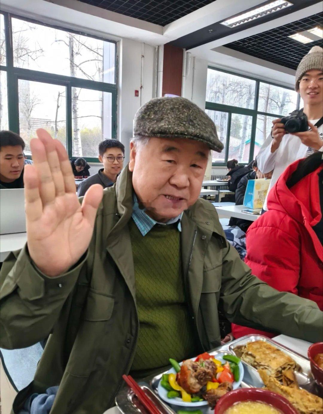 70岁的莫言在北师大饭堂被网友偶遇,他头戴前进帽,身着军绿色风衣,内搭条纹衬衫和毛线衣,打扮十分接地气。面对大家的打招呼与合影请求,他全程配合,毫无名人架子,还幽默笑道:“这让我觉得跟大家很亲近,没有距离感。”这份亲和朴实的气质,打破了人们对文学大师的刻板印象,反倒让网友更添好感。