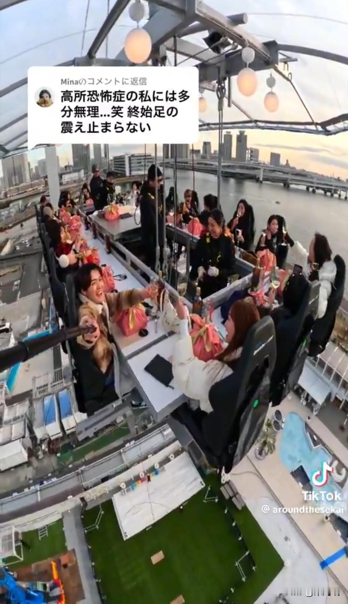 这个名为“空中晚宴”(Dinner in the Sky)的活动是一个源自比利时的限时餐饮体验,食客们会被起重机吊至约40米(130英尺)的高空用餐。 该活动已经在全球65个国家/地区举办超过10,000次。在日本,它曾于2025年3月至5月在东京举行,随后于2025年10月至12月限时登陆大阪。 平台上有22个内置座椅和一张桌子,食客需要系上安全带。用餐过程持续约30分钟到1小时,具体取决于套餐选择。食客可以在空中360度旋转,欣赏城市景观。 价格根据套餐和时段的不同而异。东京的白日套餐费用约为33,000日元(约合250美元),夜间套餐则高达40,000日元(约合280美元)。大阪的价格范围通常在22,000日元到28,000日元之间(约合142.55美元到180美元)。 该活动经过安全认证,并声称在全球范围内保持了零事故记录。