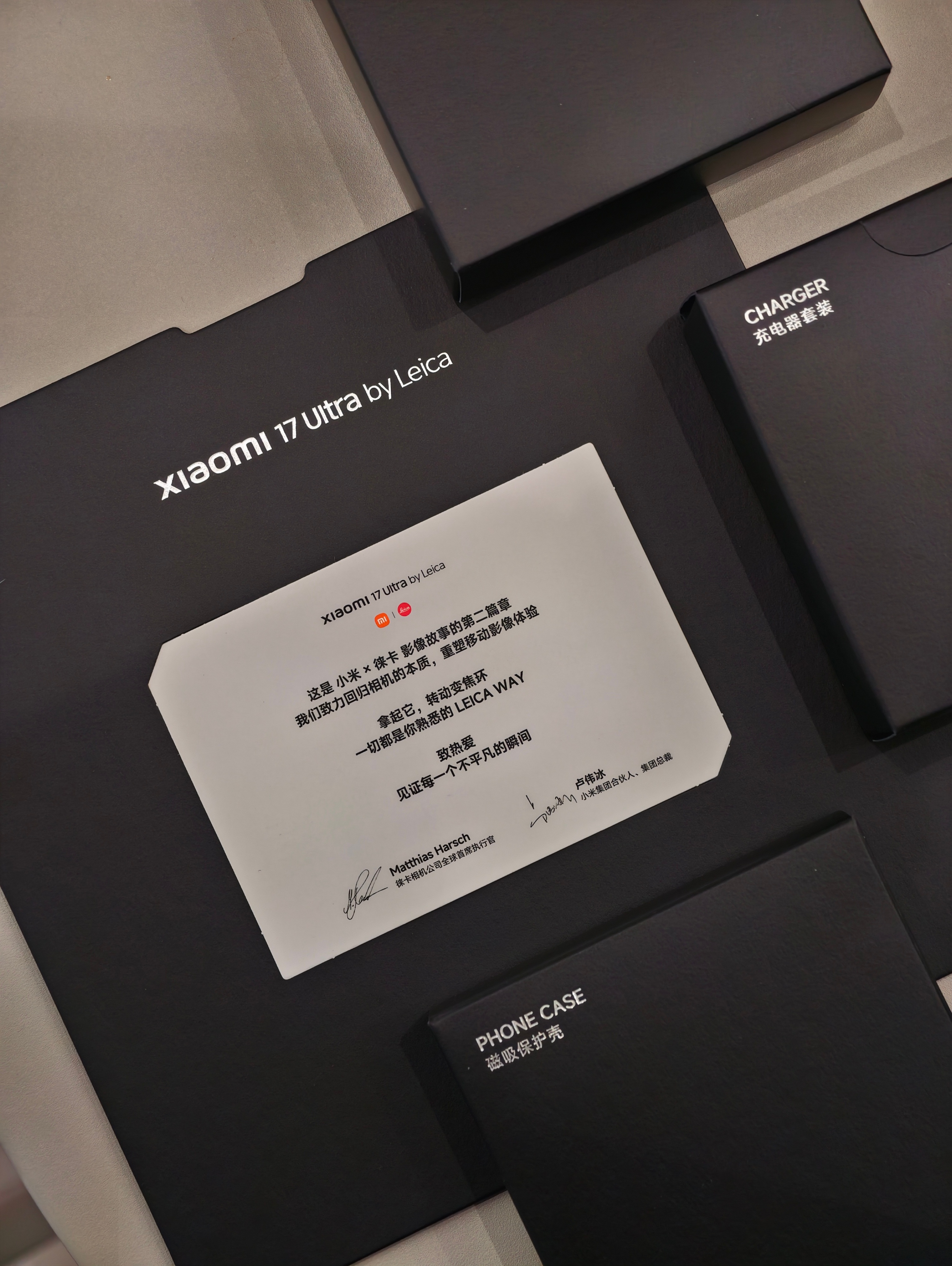 小米 17 Ultra 徕卡 24分期免息版开箱随手拍徕卡版盒内还有一个配件礼盒,有手机壳、挂绳、徕卡镜头盖,手机壳也是带徕卡标的,就连赠送的擦镜布都带徕卡标,对了,手机壳是支持磁吸,这点好评。有一说一,多花500元上徕卡版,情绪价值提供的还是很到位的,这点小米很会,开箱感受非常好有点东西