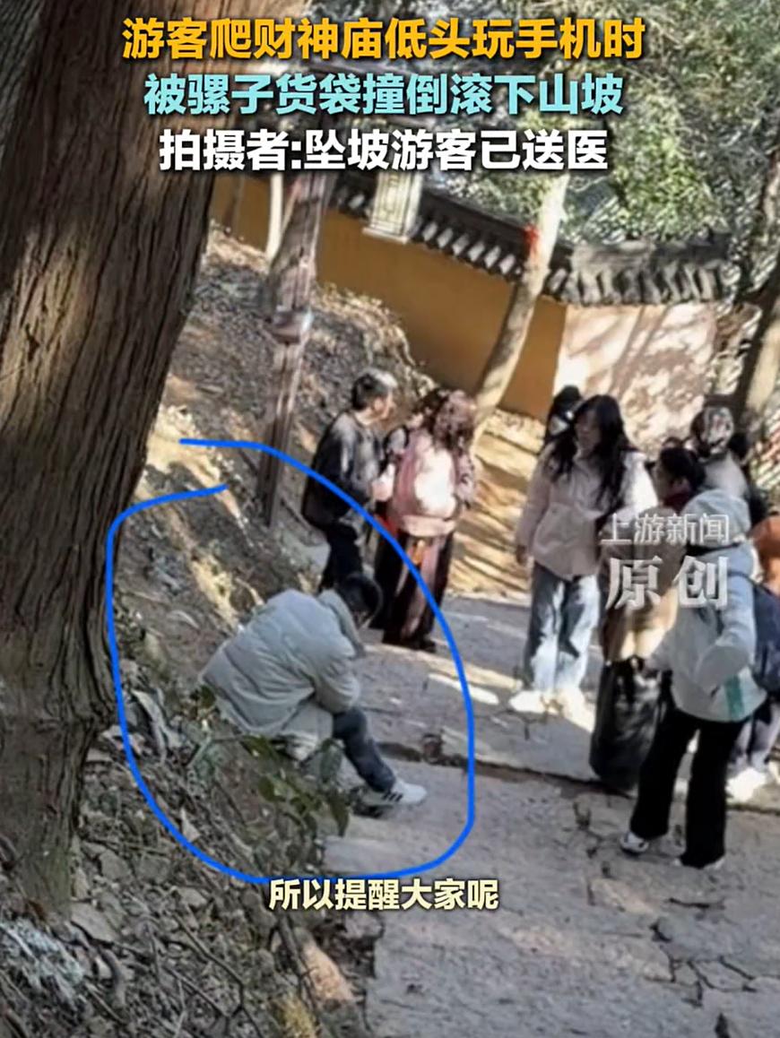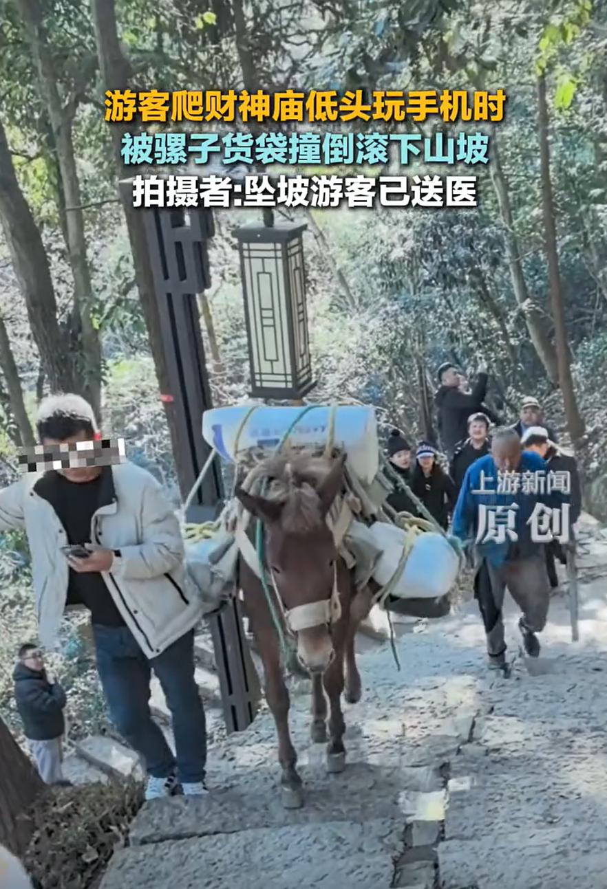 这也太倒霉了!浙江杭州,男子去天下第一财神庙景区登山,结果站在头破边上玩手机时,突然被上山骡子的货袋撞下山坡,而到底是谁的责任,也引起了不少网友的争论 视频显示,当时登山的石阶不算宽,游客也不少,其中白衣男子站在石阶的边上低头看手机,这时一位大爷带着驮着货贷的骡子上山,骡子虽然避开了男子,但身上的货贷却撞到了男子身上 他本来注意力全在屏幕上,被这么一撞,脚下猛地一滑,直接摔下了旁边的山坡。幸好坡下是另一条山路,没有继续往下滚,但这一下也够呛,视频拍摄者表示男子后面被送医了 视频被人发上网,大家吵翻了天,都觉得对方有问题 有人说,这肯定得牵骡子的大爷负责。山道就这么窄,游客又多,你牵着这么大的牲口上来,货袋左右横晃,本身就占了更多空间,就算那哥们不看手机,也难保不被刮到。主人该预见到风险,要么提醒,要么选择人少的时候运货 也有人觉得,男子自己责任不小。路窄人多,本就该多留心。他偏偏选了个最靠边的危险位置,脚下石头还不平整,注意力全扑在手机上,对周围环境不看不听,这不等于把自己置于险地吗?自己都不对自己负责,能全怪别人吗? 其实从责任角度看,这种情况很可能是多方因素叠加。骡子驮货通行在景区,属于常见运输方式,主人有提醒和避让的义务。游客在通行区域长时间停留,站在边缘位置,也等于把自己暴露在高风险里。现实中很多意外,都不是单一错误,而是几个不太合理的选择叠在了一起 但比起责任划分,我觉得对游客来说更是一个提醒,刷个消息,回个微信,觉得也就几秒钟,可环境却不会为你暂停。山路不会等你抬头,骡子不会因为你低头就自动消失