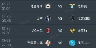 北京时间12月28日,明天的意甲第17轮安排了4场比赛,赛程如下: 第一场01:00,乌迪内斯PK拉齐奥 乌迪内斯和拉齐奥的积分很接近,乌迪内斯21分暂列第12名,拉齐奥以23分暂列第8名,本场的价值对于双方提升名次不言而喻。 第二场03:45,比萨PK尤文 比萨是升班马,也是保级球队,11分排在倒数第二,对于老牌球队尤文来说必须要力争三分。目前尤文以29分暂列第5名,距离第4的罗马只差1分,距离榜首的国米只差4分。 第三场19:30,AC米兰PK维罗纳 AC米兰是冲击冠军的球队,目前以32分暂列第二。过去4场比赛仅1胜,状态波动,杯赛和超级杯都被淘汰。 第四场22:00,克雷莫内塞PK那不勒斯 那不勒斯目前以31分暂列第3名,近期他们在意大利超级杯决赛中2-0战胜博洛尼亚夺冠,客场PK第11名的克雷莫内塞力争三分。