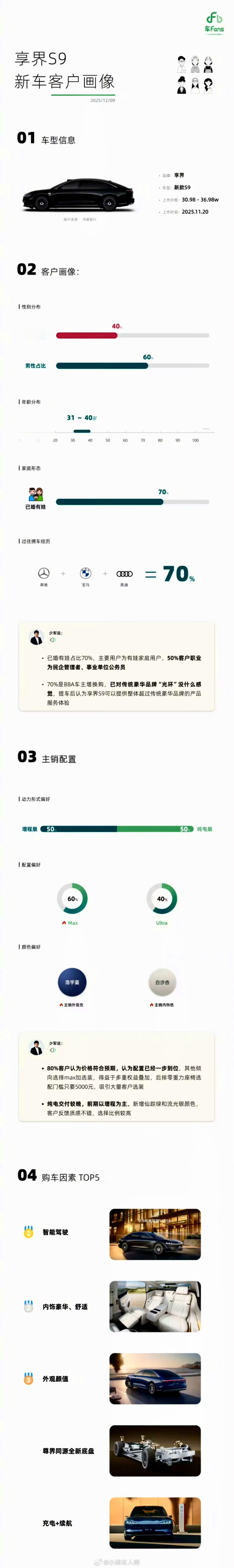 以前30万以上的豪华轿车基本就是BBA(奔驰、宝马、奥迪)的天下,但现在,华为和北汽联手打造的“享界”真把格局给打破了。他们推出的两款旗舰车型——享界S9和S9T,不靠老牌子讲故事,而是实打实用华为的硬核技术说话:鸿蒙智能座舱、高阶智驾、高级底盘、全方位安全……从开车到坐车,体验直接拉满。而且不只是功能强,连氛围感、情绪价值都照顾到了——开得舒服,坐得安心,用着顺手,还有面子。享界S9一上市2小时,订单就冲破2000台 S9T更夸张,66天卖了超3万台,11月直接冲进30万以上豪华车销量前四,跟BBA正面硬刚。渠道也在快速铺开:上百个原来卖BBA、保时捷的豪华车经销商,现在主动申请加入享界;全国近300家用户中心+600家华为门店一起服务用户,买车、看车、售后都方便多了。 超70%买享界S9的人,之前开的是BBA,S9T也有将近40%是从BBA换过来的。大家现在选车,越来越理性了——不再只为那个“标”多花十几万,而是更看重:科技是不是真先进?坐着是不是真舒服?日常用是不是真省心?能不能满足工作、家庭、旅行各种场景?享界S9适合商务精英,稳重有范儿;S9T则更适合爱家庭、爱自由、爱探索的人。一个讲质感,一个讲生活,刚好覆盖两种主流高端需求。说到底,享界的崛起不是偶然。它代表了一种新趋势:豪华不再是老品牌的专利,而是谁真正懂用户、有技术、能带来全方位好体验,谁就能赢得人心。