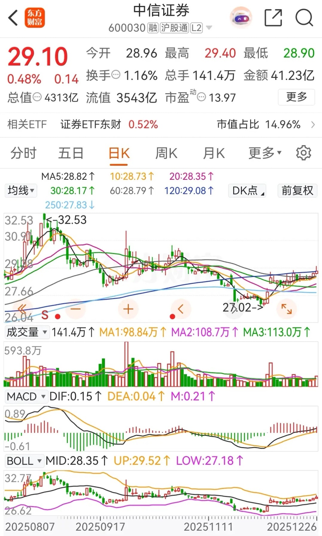 东方财富和中信证券连续三天上涨,连续两天被主力资金净买入,在2025年内的上涨幅度分别是,东财跌 8.35%,中信涨了 0.73%。东方财富周五平开后冲高回落,收盘时放量上涨了 1.16%,盘中最高涨幅曾高达3.04%,报价为23.61元。在资金流向上,周五当天被主力资金大幅净买入了6.3026亿元,本周则是被主力资金合计买入了1.1996亿元。从走势上看,周五收出的这根放量小阳线站上了年线,MACD指标在 0 轴下方形成了金叉,快线正在向 0 轴靠近,虽然弱势,但是趋势却是向好的。此外,本周的周线收阳,涨幅为2.65%。中信证券周五的走势同东财一样,也是平开后冲高回落,收出了一根带上影线的小阳线,涨幅为0.48%,报价为29.10元。在资金流向上,连续两天被主力资金净买入,周五当天的净买额为0.8731亿元,本周则是合计净卖出了2.9975亿元。从走势上看,中信证券日线连续三天收阳,且站上了半年线,上方再无均线压制,技术面上呈现多头排列,整体走势强于东方财富。对于券茅和一哥,二者的后续走势,可以乐观看待,主要是存在着估值修复的空间。目前券商概念板块的PB仅1.52倍(历史40%分位),ROE预期达70%分位,存在修复潜力。但东方财富需消化高估值压力,中信证券需摆脱政策工具化标签。