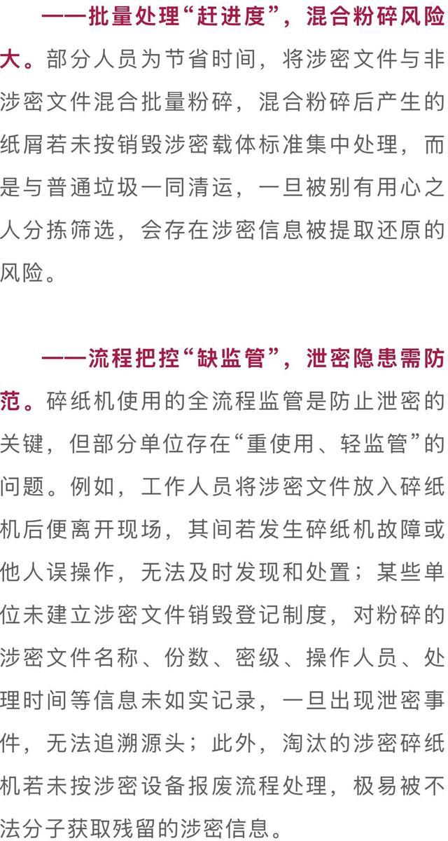 根据国家保密局规定,涉密载体销毁应当使用符合国家保密标准的销毁设备和方法,确保信息无法被还原,即载体销毁后形成的残留物或残片上不存在可以读取的任何涉密信息,且采用现有技术措施无法恢复。国家秘密关乎国家安全和发展利益,涉密载体销毁的每一个细节都承载着沉甸甸的责任。唯有保持“时时放心不下”的责任感,严格规范碎纸机使用,才能筑牢涉密载体销毁的“最后防线”,切实维护国家秘密安全。广大人民群众如发现可疑情况,请及时通过12339国家安全机关举报受理电话、网络举报平台(www.12339.gov.cn)、国家安全部微信公众号举报受理渠道或者直接向当地国家安全机关进行举报。