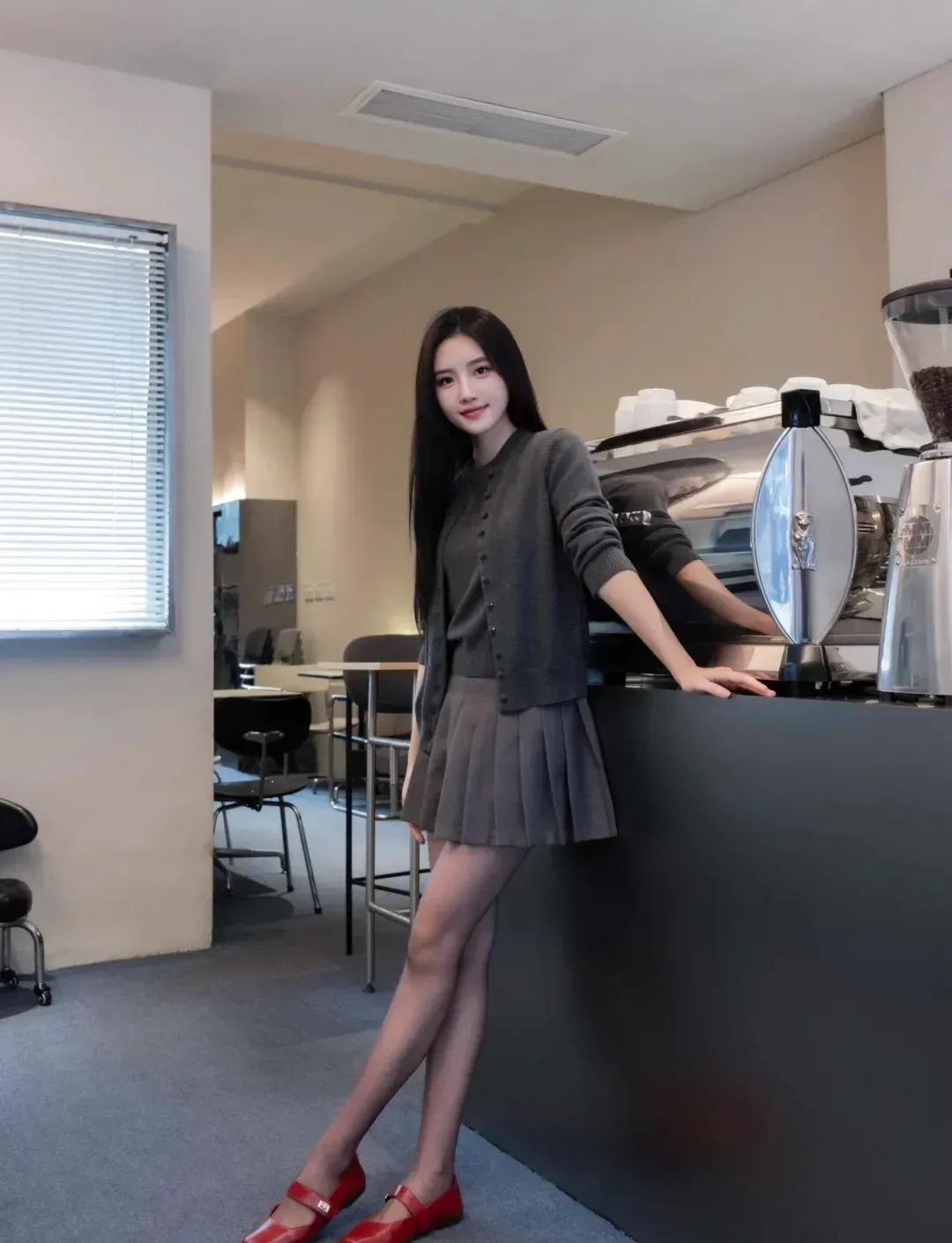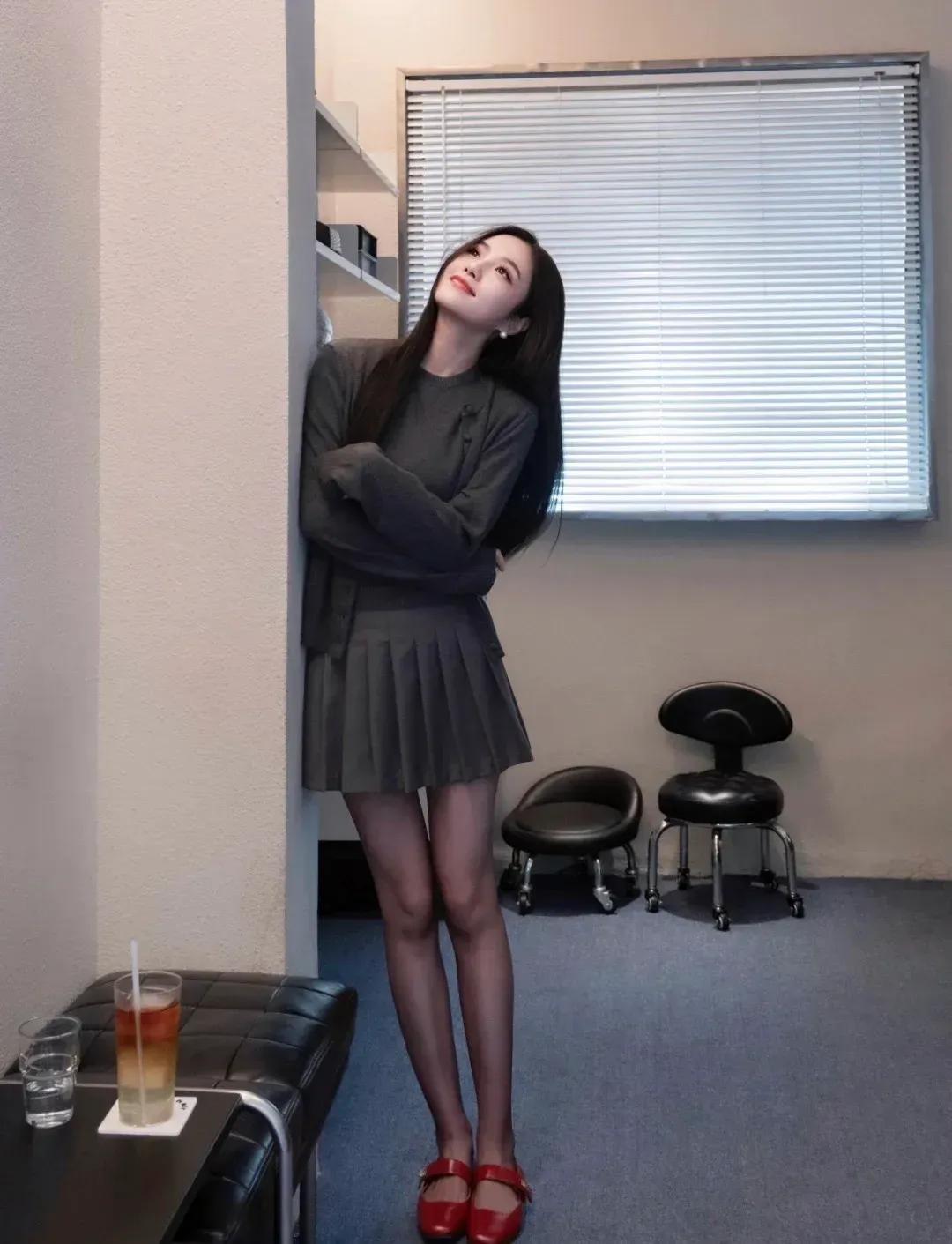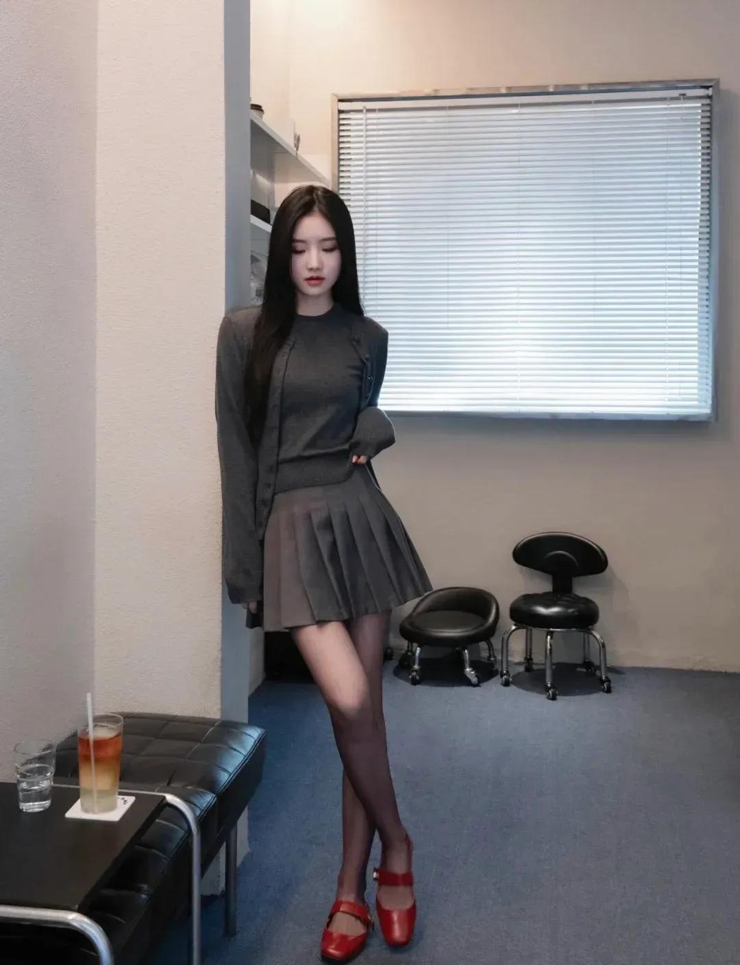 这套穿搭是甜酷轻熟的灰调学院风,把温柔松弛和灵动细节结合得很巧妙。深灰针织上衣+百褶裙的同色系套装自带温柔慵懒感,百褶裙注入学院风的甜美元素,宽松版型营造松弛氛围,适配日常轻社交或休闲场合。 搭配红色玛丽珍鞋是点睛之笔,为沉稳灰调注入亮眼活力,让造型更显灵动。 充分展现穿着者甜酷轻熟的学院风魅力。灰裙穿搭