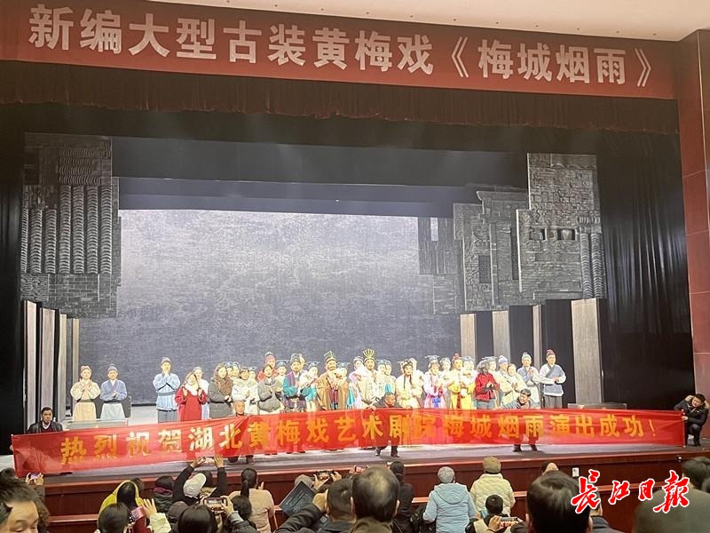 新编大型古装黄梅戏《梅城烟雨》演出谢幕场景。记者万建辉摄