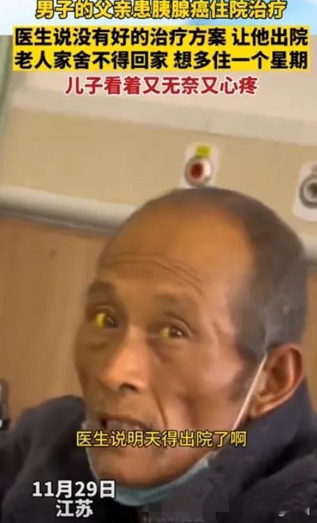 “这就是穷人的悲哀!”2023年11月,江苏一大爷确诊为胰腺癌,医生劝他回家该吃吃该喝喝,老人却哀求儿子再给他交几天住院费,他不想回家等死。可这个病不但治不好,更多的钱也拿不出来,儿子只能拒绝了父亲的请求,大爷被拒后,发黄的双眼无神地看着空气,让人十分心疼。 江苏的天气已经彻底冷了下来。医院走廊里消毒水的味道混着暖气的热气,沉沉地压在人的胸口。老李躺在病床上,身下的白色床单已经被他翻得起了褶子。 他瘦得厉害,锁骨像两根突起的枯枝,皮肤泛着蜡黄,眼白却浑浊发暗。 医生的话还在耳边回响—— “胰腺癌,晚期了,回家吧,该吃吃,该喝喝,别折腾了。” 这句话像一把钝刀,没有立刻见血,却一点点割着人的心。 老李已经七十二岁了,一辈子在建筑工地干活,扛水泥、扎钢筋,没文化,也没攒下什么积蓄。年轻时他总说,苦点累点没事,孩子将来能轻松点就行。 可等真病倒了,他才发现,原来一辈子的辛苦,在命面前,轻得像一阵风。 那天傍晚,儿子小李坐在病床边,低着头翻着手机里的缴费记录。余额数字一行一行跳出来,每一个都像在提醒他:钱快没了。 老李看着儿子的背影,张了好几次嘴,才艰难地开口:“医生……是不是要我走了?” 小李喉咙一紧,没有回答。 老李却像是明白了什么,苦笑了一下:“我不怕死……就是不想这么快回家。” 他说这话时,声音很轻,却透着一股固执。 “再给我住几天吧。”老李抬起眼,眼神里带着一点近乎卑微的恳求,“我不想一回家,就等着那天到。” 小李的手顿在半空,屏幕上的数字刺得他眼睛发酸。他当然明白父亲在怕什么——怕回到那间老房子,怕夜深人静时疼得没人知道,更怕一闭眼,就再也醒不过来。 可现实比任何情绪都冷。 医生已经说得很清楚了,治不好,继续住院只是多花钱。家里能借的都借了,能卖的也卖了,再撑下去,只是把负担留给活着的人。 小李低下头,声音发颤:“爸……医生说了,这病治不好了。再住下去,也没用了。” 老李的手慢慢攥紧床单,指节因为用力而发白。 “我知道治不好。”他喘了口气,“我就想……再活得像个人几天。” 这句话,像一根针,狠狠扎进小李心里。 可他还是说不出口“好”。 沉默在病房里拉得很长,只有监护仪规律的滴答声,一下一下敲着人的神经。终于,小李抬起头,眼眶通红,却强迫自己把话说完整。 “爸……儿子没出息。” “钱真的……拿不出来了。” “咱……回家吧。” 他说完这句话,像是被抽空了力气,整个人塌坐在椅子上。 老李没有再争辩。 他慢慢松开攥着床单的手,目光一点点失去焦点。那双因为长期劳作而粗糙的手,安静地放在被子上,像是已经认命。 他抬头看着天花板,又像是什么都没看,只是空空地望着。 那一刻,小李第一次清晰地意识到,父亲是真的老了。 不是那个在工地上吼着工人干活的汉子,也不是雨夜里骑着三轮车送他去医院的男人,而是一个被疾病一点点逼到角落,却还想再抓住几天活着感觉的老人。 办出院手续那天,老李被推着经过长长的走廊。旁边病房里,有人插着管子抢救,有人家属低声哭泣。老李听见这些声音,却没有任何反应,只是静静地看着前方。 出了医院大门,冷风迎面吹来,他忍不住打了个寒战。 小李赶紧把外套给父亲披上,嘴里不停地说:“爸,回家了,回家了。” 老李点点头,却没有笑。 回到家后,老李坐在熟悉的旧沙发上,看着墙上泛黄的全家福,眼神复杂。他知道,自己这一回家,大概就再也走不出去了。 可他什么也没说。 那天晚上,小李听见父亲在房间里轻轻叹气,一声接一声,像是在数着剩下的时间。小李躲在门外,死死捂着嘴,眼泪无声地往下掉。 他不是不孝,只是真的无能为力。
