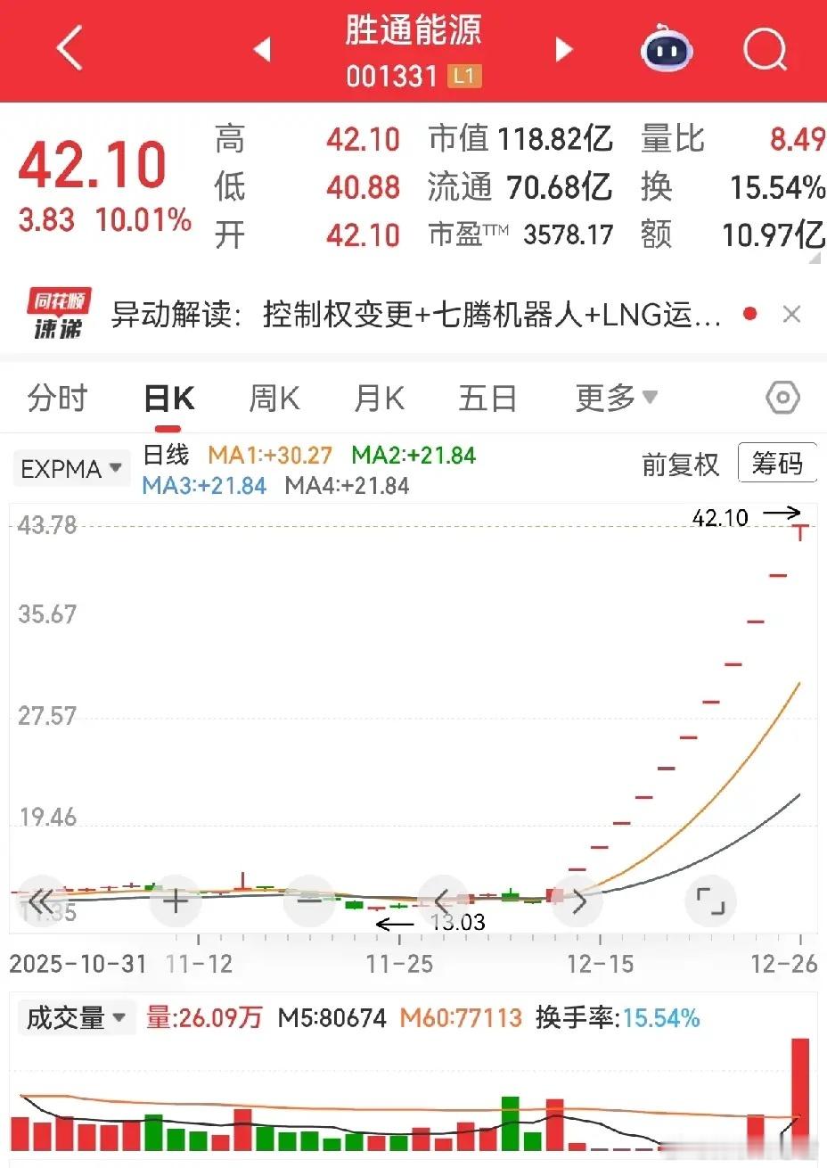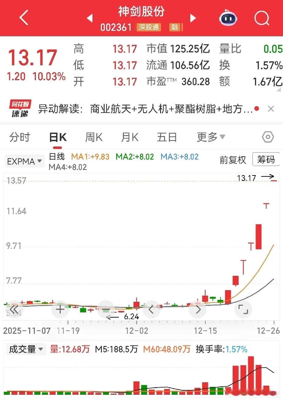 商业航天异动追踪:航天发展、神剑股份等标的策略解析商业航天主线强势领跑,龙头标的航天发展精准规避异动监管红线,十日偏离值未超100%、三十日偏离值未超200%,且未触发十日内同向异动四次标准,下一个交易日无异常波动风险,主力操作合规性拉满。神剑股份同步把控节奏,12月15日至26日股价从7.14元攀升至13.17元,偏离值未触碰100%警戒线,后续交易日延续合规走势概率高。嘉美包装虽已超出监管标准,但凭借连续一字板锁定筹码,主力无需大额资金即可封板,在获利盘未大规模出逃的背景下,顶格涨停态势或持续至停牌,复刻天普股份、上纬新材过往走势逻辑。胜通能源周五换手率达15%,筹码出现松动迹象,后续再掀一字涨停潮难度加大,主力大额操盘易触发监管关注。