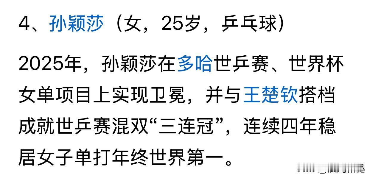 新华社评出国内十大体育新闻和十佳运动员,国乒没被点名、孙颖莎榜上有名 作为以国家队参赛的运动队,中国乒乓球队当属第一名,国乒也在本年度取得了团体和个人最多的金牌,但是无一项入选国内十大体育新闻。 多部门联动整治体育饭圈乱象 巴奥后饭圈文化成为了侵蚀中国体育的重点,各主流媒体表示尤以国乒为重,突出的是奥运女单卫冕冠军陈梦所受伤害最重。 新华社十大体育新闻再提整治饭圈,国乒没被点名是留足了面子啊! 世乒赛和世界杯双重女单卫冕冠军,和王楚钦世乒赛混双三连冠,孙颖莎入选国内十佳运动员。 孙颖莎这些成绩的取得,离不开平时挥汗如雨的训练、一拍拍扣杀得分的比赛,如今孙颖莎因伤缺席乒超联赛总决赛,如何保护奥运主力队员的身体健康,成为了乒协当下的重点工作。