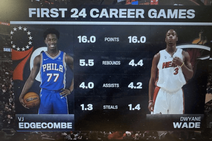 VJ-埃奇库姆本赛季至今为76人出战24场,场均可以得到16分5.5篮板4助攻,与韦德生涯同期的数据十分相似。