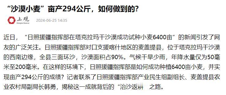 万万没想到,中国工程闹了个大“乌龙”,原本以为在沙漠种小麦产量会很低,不料一亩地产了294公斤,无意间竟还攻克了一个难题! 在塔克拉玛干沙漠西南边缘,有个全国唯一嵌入沙漠的县城——麦盖提县。 2010年以前,这里90%的土地都是沙化土地,年均沙尘天气多达150多天,沙漠离县城最近时只有5公里,黄沙随时可能吞噬绿洲。到了2010年,对口支援麦盖提县的治沙工程正式拉开序幕,并开展了初期的调研。 当时的景象有多艰难?当地老人回忆,沙尘暴一来,小孩哭得上气不接下气,满脸都是尘土,只有两行泪痕清晰可见。不治沙,当地人就没法安稳生活。 2012年秋天,麦盖提县启动了塔克拉玛干沙漠边缘外围防风固沙生态林建设工程,规划总面积达100万亩。从这一年开始,每年春秋两季,全县各族干部群众加起来有30万人次投身治沙,在茫茫黄沙里挖坑、栽苗、浇水,一点点向沙漠进军。 治沙的每一步都充满挑战。麦盖提县东边是沙漠,西边是叶尔羌河,没法借助河流形成天然治沙屏障,只能靠人工硬拼。 为了让苗木存活,大家整合各类项目资金,在林区铺设滴灌46万亩,修建林区道路365公里,还架设了350公里的输电线路,保障治沙工程能持续推进。 那些年里,新疆杨、胡杨、红柳、梭梭等耐旱苗木被一株株种进沙漠,从最初的零星绿意,慢慢连成一片。一年又一年,治沙人从未停下脚步。 他们坚持本土化育苗,让苗木成活率达到95%以上,短短12年就建成了46万亩人工防风固沙林,形成了一条南北长55公里、东西宽2000到4000米的绿色屏障。 曾经肆虐的黄沙被渐渐“蚕食”,退到了二三十公里开外,全县风沙天气从每年150多天减到50天以下,沙尘暴几乎绝迹,连降水量都逐年增加。 更让人惊喜的是,库木库萨尔乡原本被沙漠包围,如今变成了4A级景区,柏油路、行道树、绿树掩映的民居,再也看不出曾经沙漠环绕的模样。 而随着治沙成效越来越显著,一个更大胆的想法被提了出来——在沙漠里种小麦。2023年,在山东省日照市援疆指挥部的支持下,新疆五征绿色农业发展有限公司开始在沙漠边缘尝试种植冬小麦。 这个想法刚提出来,不少当地农民都直摇头:“沙子里能长庄稼?那简直是天方夜谭。”毕竟沙漠土壤颗粒粗,保水保肥能力几乎为零,种子刚发芽就可能被风沙掩埋。 为了让小麦在沙漠存活,团队下足了功夫。他们增施有机质和固沙保水剂,喷施植物抗菌剂改良土壤,还采用了“干播湿出”的模式,利用小流量滴灌技术,把水分利用率从传统灌溉的30%提升到85%以上。水肥控制全程通过手机操作,定时定量精准输送,既节水又节肥。 2023年10月,6000多亩冬小麦被小心翼翼地播种入土,接下来的几个月里,大家日夜守护,看着麦苗经历越冬、抗旱、防沙的重重考验,一点点长大。 2024年6月,麦盖提县的沙漠边缘迎来了历史性的一刻——6000多亩沙漠冬小麦正式开镰收割。大型联合收割机在麦田里来回穿梭,金色的麦穗被卷入机器,脱粒后的麦粒饱满金黄,源源不断地倒入运粮车。 当测产结果出来时,所有人都激动不已:这片沙漠里种出的小麦,容重达到825克/升,是一级小麦标准,亩产更是达到了294公斤,远超最初的预期。 谁也没想到,原本只是想试试在沙漠种粮保产量,竟无意间攻克了大难题。小麦根系分泌的有机酸中和了土壤碱性,秸秆还田后还增加了土壤有机质,让沙漠土壤的盐碱度下降了40%。 更神奇的是,松散的沙地慢慢变得紧实,地表形成了黑色结皮层,地下水位也上升了0.8米,周边的胡杨林抽新芽,红柳丛里甚至出现了野兔的踪迹。 从2010年的漫天黄沙,到2024年的金色麦浪,14年的时间,对口支援团队和麦盖提县各族群众用坚持和汗水,在塔克拉玛干沙漠边缘创造了奇迹。曾经寸草不生的沙漠,不仅变成了绿洲,还种出了优质小麦。 这段从治沙到种粮的传奇历史,不仅改变了麦盖提县的面貌,更给全球沙漠治理和农业发展提供了宝贵的中国经验,让世界看到了“绿进沙退”的中国力量。