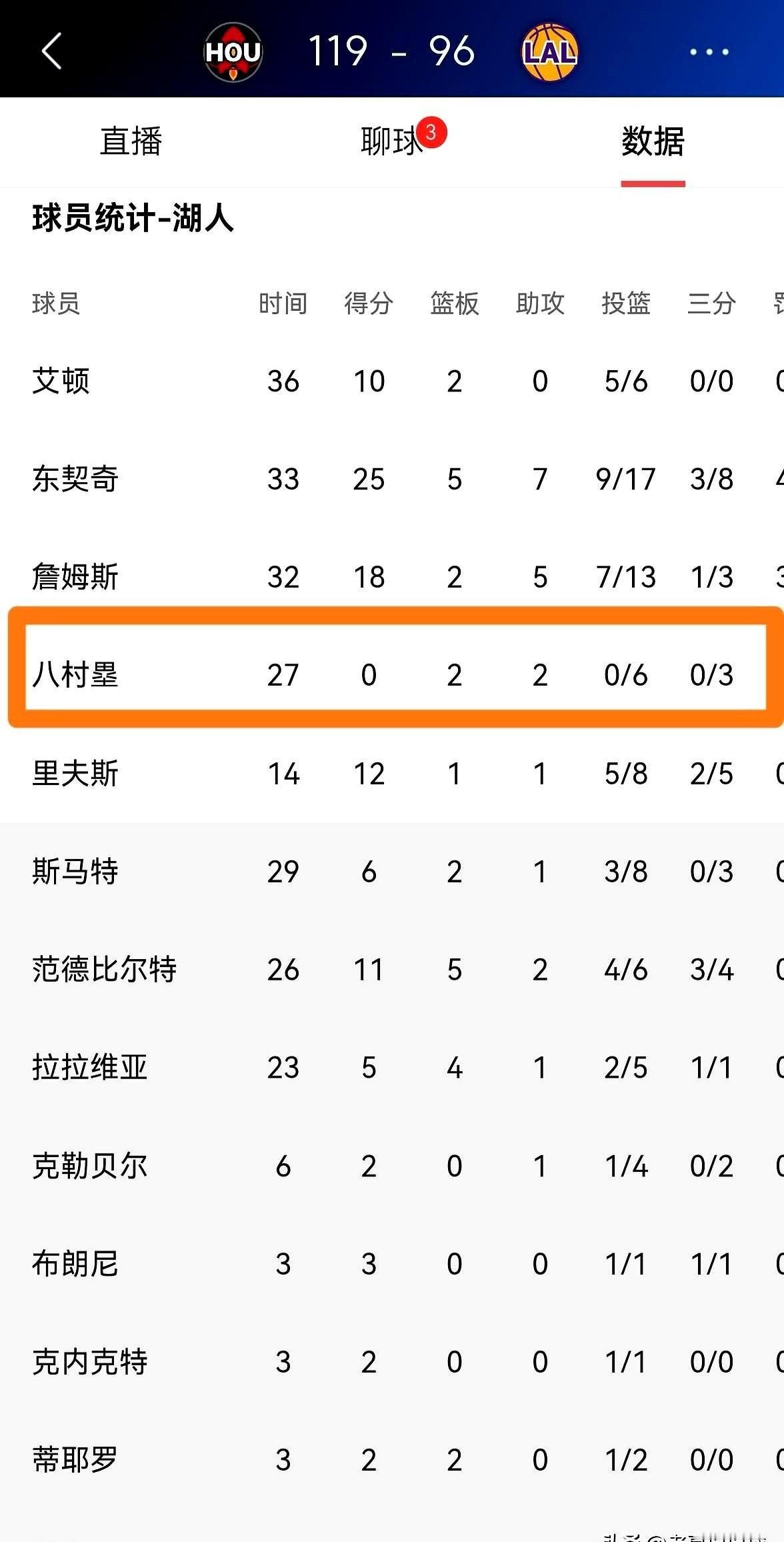 八村塁圣诞大战0分,湖人这首发真该换了? 2025年圣诞夜,湖人主场96比119被火箭队锤了,输了足足23分。首发出战27分钟的八村塁,全场6投0中,一分没拿,进攻端铁成这样。-29的正负值,全队第二差。 这表现确实扎眼。要知道,他刚从腹股沟伤病里恢复,赛前都还是出战成疑。可这也不是他本赛季第一次得0分了。整场比赛湖人篮板被爆,全队都不在状态,连主教练雷迪克赛后都质疑球队的求胜欲。 球迷圈直接炸了。有人喊“赶紧交易吧,趁还有价值”。也有人觉得“刚伤愈复出,多给点时间调整嘛”。 一场论英雄有点过了。他这赛季场均13.1分,三分命中率过四成,平时还是挺能打的。湖人遭遇三连败,问题显然不只在八村一个人身上,更像是全队的体系和心态出了毛病,毛病不小。 所以,八村塁是成了替罪羊,还是湖人真得动刀了?这球,你看懂了吗?