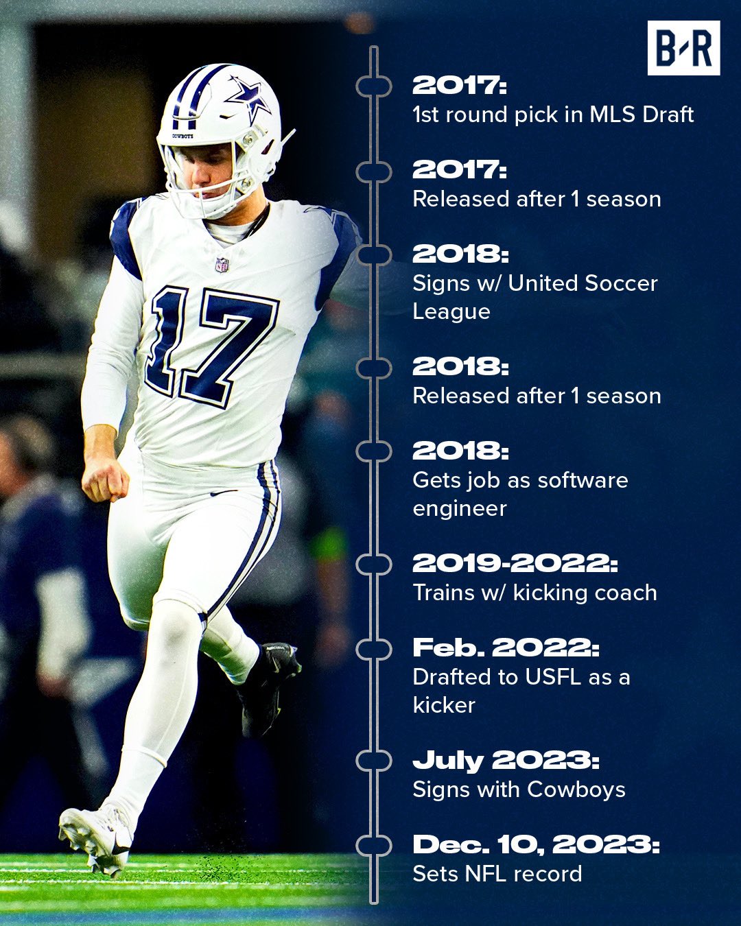 2023年12月10日,在牛仔队以33-13战胜费城老鹰队的比赛之后,布兰登-奥布里在他的新秀NFL赛季中的踢球数据如下: