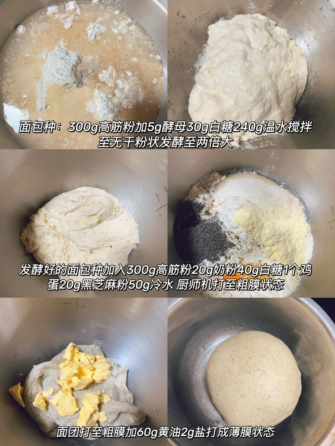 面包种: 300g高筋面粉 5g耐高糖酵母 30g白糖 240g温水