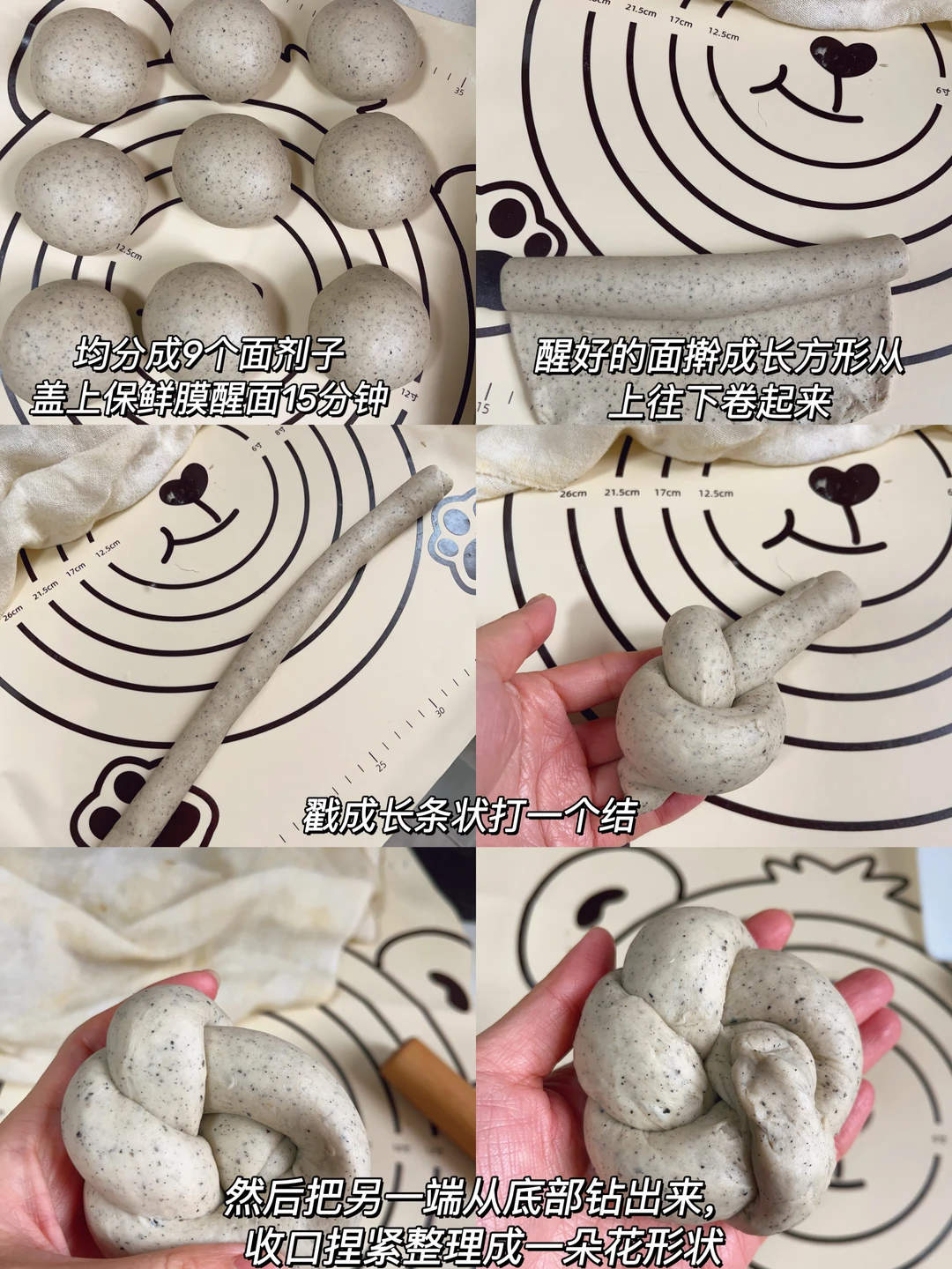 4⃣️松弛好的面团擀成长方形,戳成长条状,可以撒点干面粉防粘,然后整理成花朵形状,放入烤盘中,烤盘可以铺一层油纸,整理好的面团醒发至两倍大