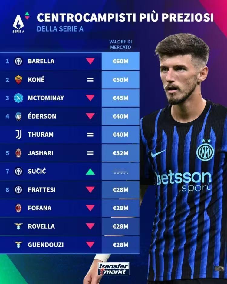 比中场,意甲国际米兰的中场最贵! 德转意甲中场排行榜出炉,国际米兰占三席,巴雷拉