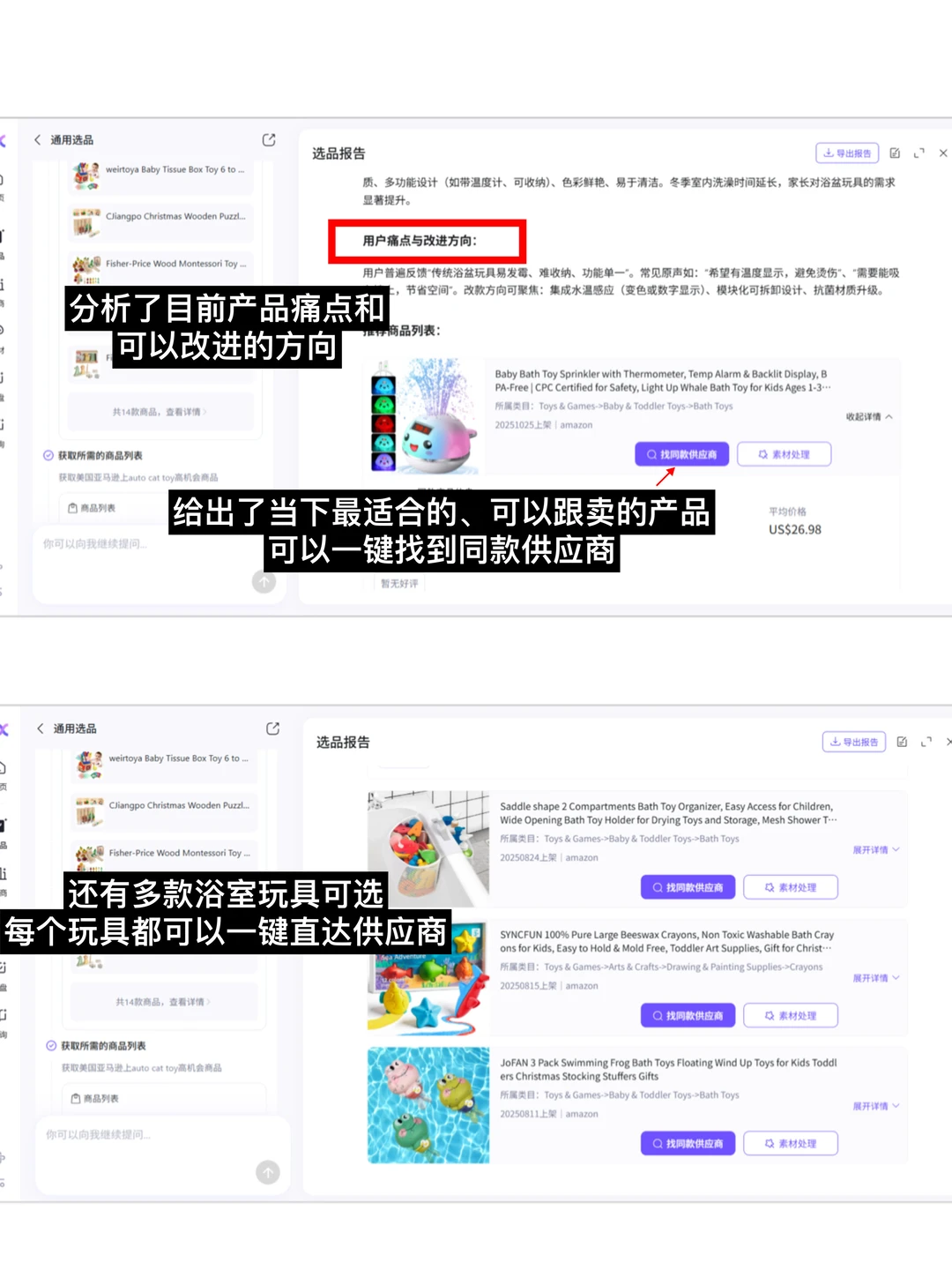它给到我的答案包括“幼儿浴盆玩具”“锁与钥匙益智玩具”“自动猫玩具”,在这几个搜索结果中,最让我感兴趣的是“幼儿浴盆玩具”,我会想要尝试这个细分类目,因为遨虾不仅给出了方向,还分析了市场潜力——竞争度低、需求稳定,并且直接关联了靠谱的供应商。