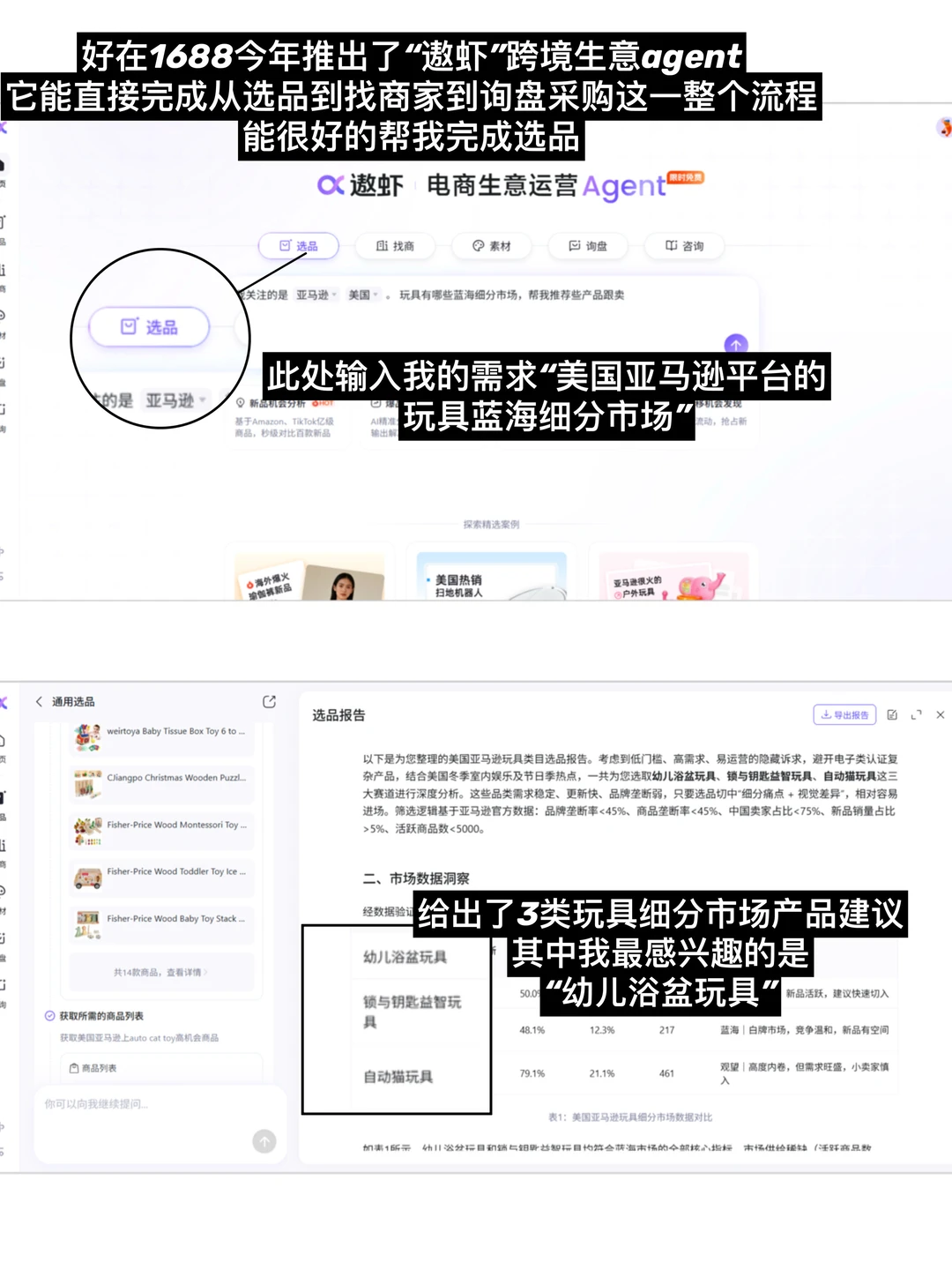 不过好在1688推出了“遨虾”跨境生意agent,尤其是它的选品功能,直接帮我打通了海外选品的关键环节。