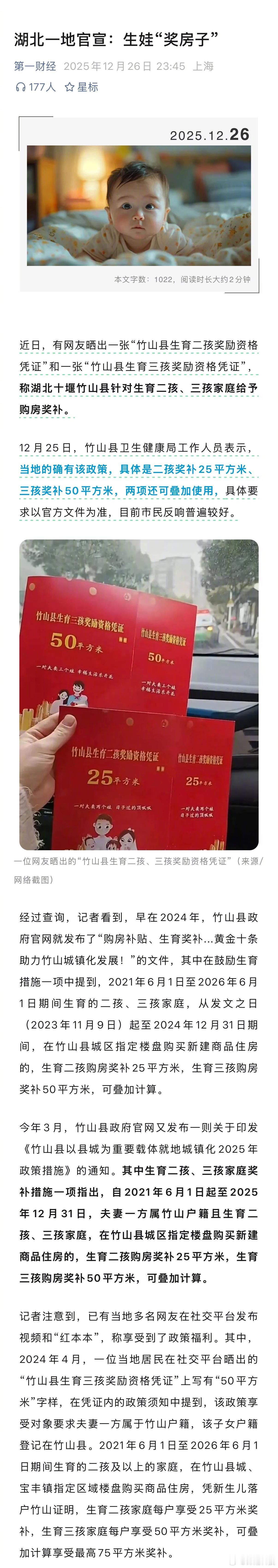 生娃“奖房子”,生二孩奖补25平米,三孩奖补50平米,可叠加。