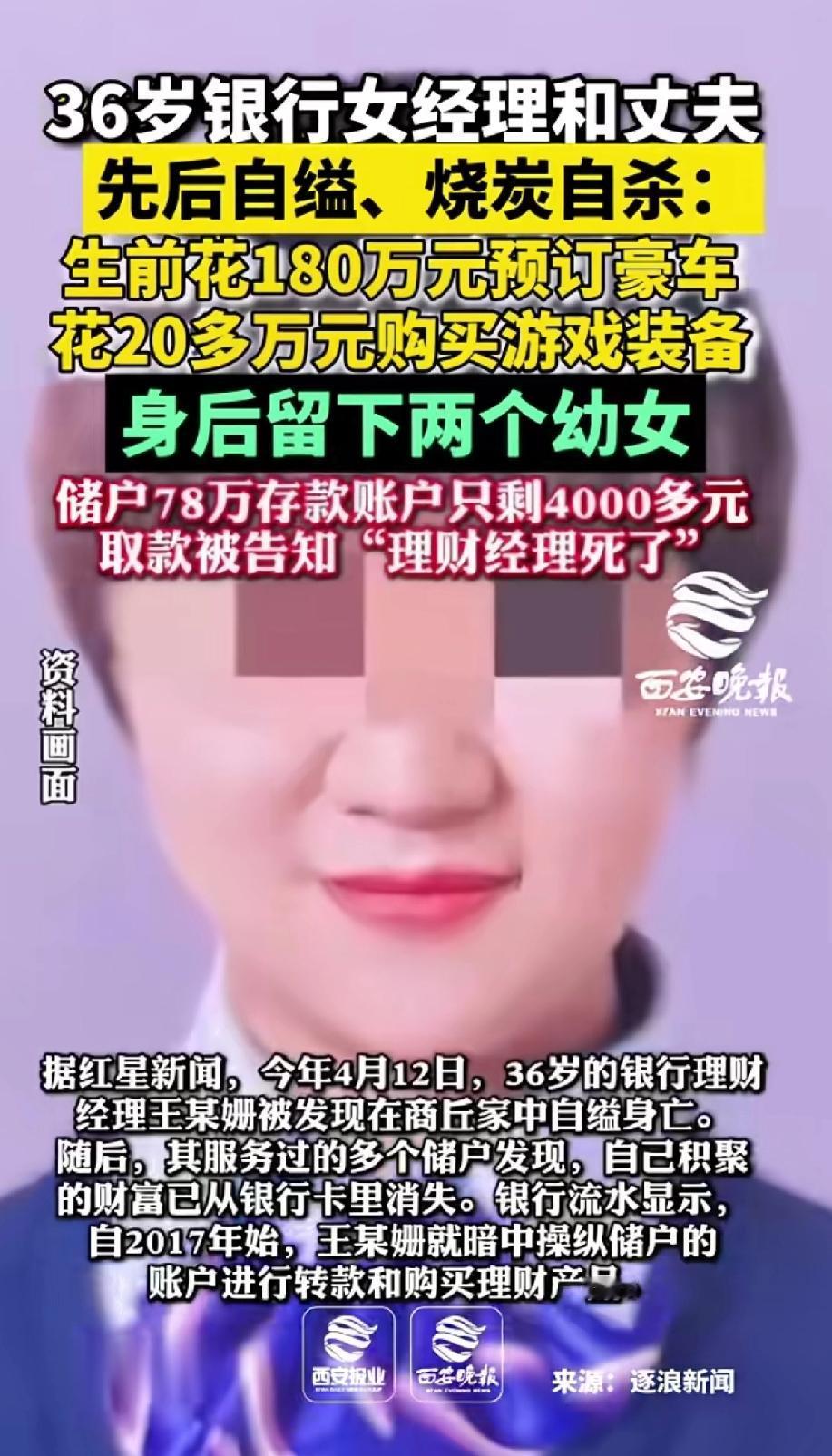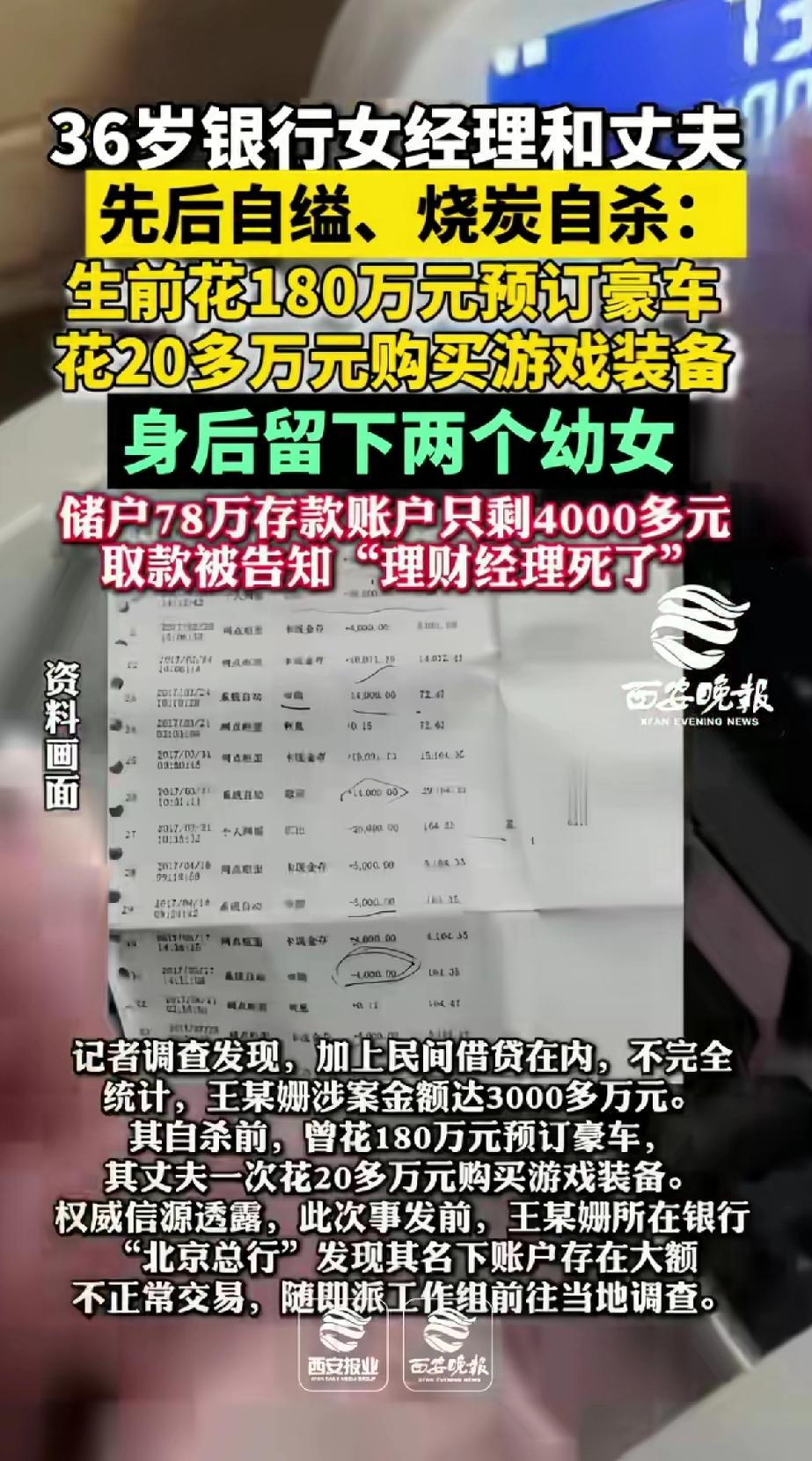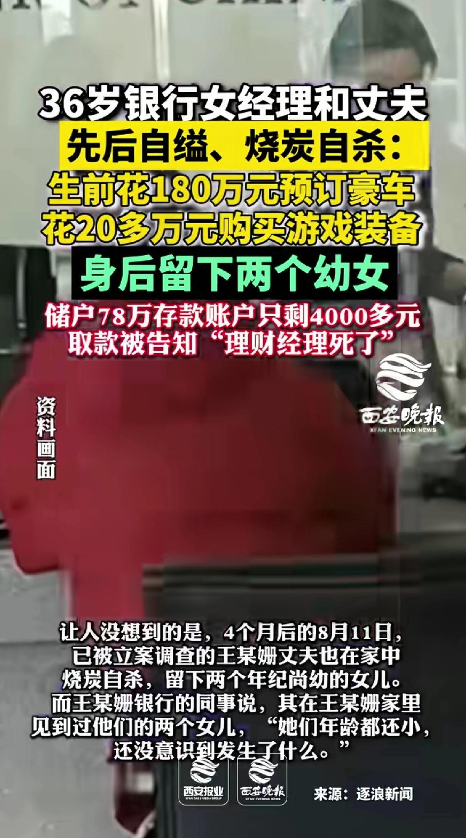 36岁的银行女经理和丈夫,商丘家中先后自缢、烧碳身亡,生前花180万元预订豪车,生后留下两个幼女。 受害人丽丽因儿子要定亲,打算把储户里的78万存款取出来,她多次联系理财经理王某未果。今年4月份取钱时被告知“理财经理死了”!78万的账户也只剩下4000多元。 今年4月,理财经理王某姗自缢身亡,随后储户发现钱没了。原来从2017年起,她就暗地操纵账户转款、买理财。8月,其丈夫烧炭自杀,留下俩年幼女儿。 不完全统计,王某姗涉案3000多万,自杀前还花180万预订豪车,她丈夫一次花20多万买游戏装备。事发是银行总行发现她账户大额异常交易才调查的。 看来这夫妻俩是典型的“畏罪自杀” 靠身兼重职,不当得利,眼看着就要东窗事发,自知逃脱不了,只能以死来解脱。 想想也是,平时夫妻俩利用职务便利,获利不少,物质生活大大提高,现在被调查自知要面临牢狱之灾,肯定受不了,情愿自杀也不愿意后半辈子在牢房度过。 因嫌疑人死亡,警方撤案,受害人只能走民事诉讼挽回损失。这背后是无数家庭财富的损失,也给两个孩子留下了残酷的现实。