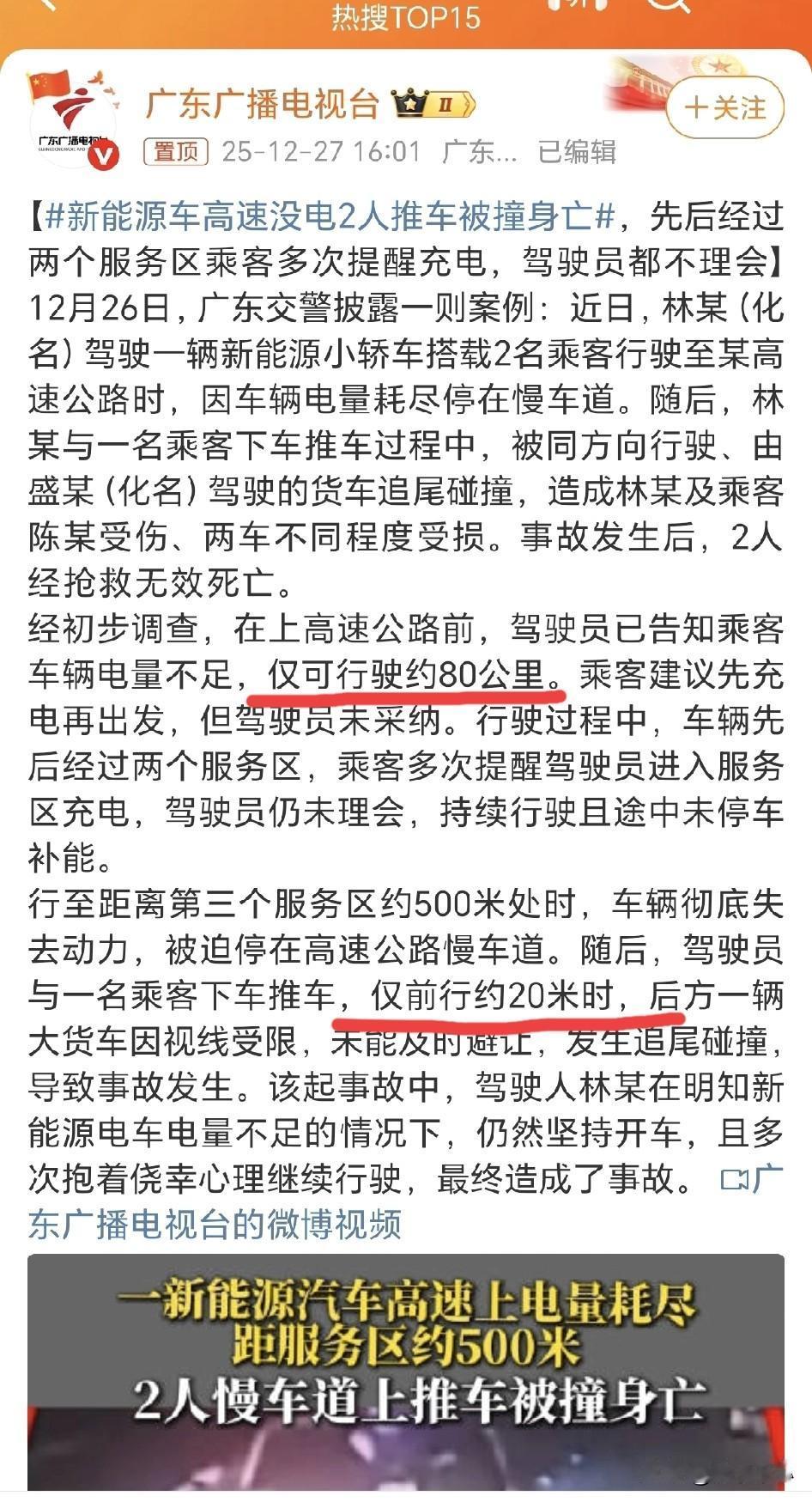 见过离谱的,竟没见过如此离谱的! 一次侥幸还不知足,竟还多次侥幸,结果变成了“豪赌”2条人命,3个家庭,想想都令人气愤。 12月27日,广东广播电视台报道,12月26日,广东交警分享了一起严重的交通事故案例。 原本这场交通事故是可以避免的,可仅仅因为驾驶员的固执葬送了2条人命。 我们根据报道梳理一下事情的经过。 事故是近期发生的,林某(化名)是司机,驾驶一辆新能源电车,林某的车上有2名乘客,乘客上车后,林某曾告知剩余电量不足,大约能行驶80公里。 乘客对此给出意见,可以先充电再上高速,但驾驶员林某并未采纳,这是林某的第一次侥幸。 上了高速后,中间路过了2个高速服务区,乘客又多次提醒林某进入服务区补电。结果驾驶员林某仍然没有采纳,这里就存在2次侥幸。 当林某驾驶车辆距离第3个服务区只有500米的时候,车辆彻底没电了。 此时车辆在慢车道,于是就有了司机林某和其中一个乘客一起推车的事情。 车辆仅仅推行20米,就被后方行驶的大货车撞上了(视线受阻,未能及时避让)。 2人经抢救无效死亡。 试想如果没有司机林某的一次次侥幸,又岂会出现高速路上下车推车的事情,没有推车,那又怎么会出现被货车追尾的事情! 一次侥幸还不知足,竟还多次侥幸,最终用侥幸换来了惨重的代价。 这个过程中,追尾的大货车虽然存在责任,但也会觉得有点“倒霉”。 至于司机,只能说是自己一手造成的。 最为无辜的就是乘客,一次次善意的提醒没想到竟是如此下场! 这件事告诉我们,人得敬畏生命,生命面前绝对不要存在侥幸心理。 对此大家又是怎么看?欢迎评论区留言讨论!