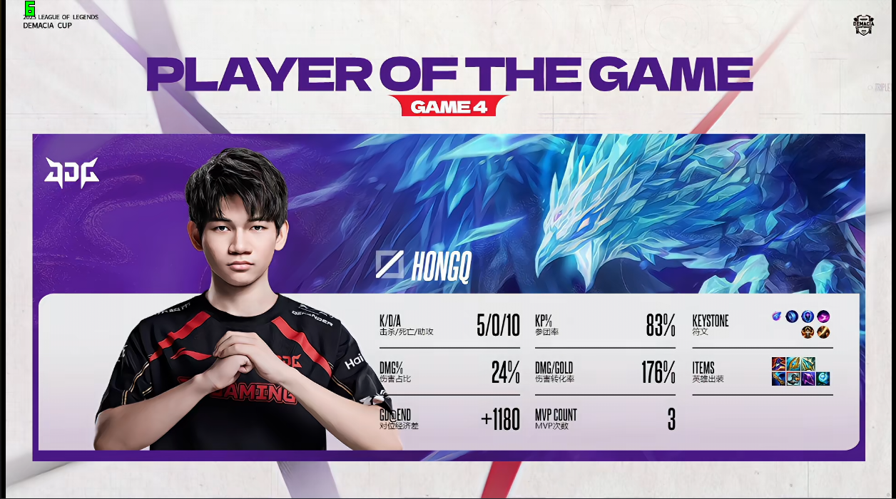 HongQ冰鸟打出5/0/10战绩,斩获JDG对阵EDG第四局MVP