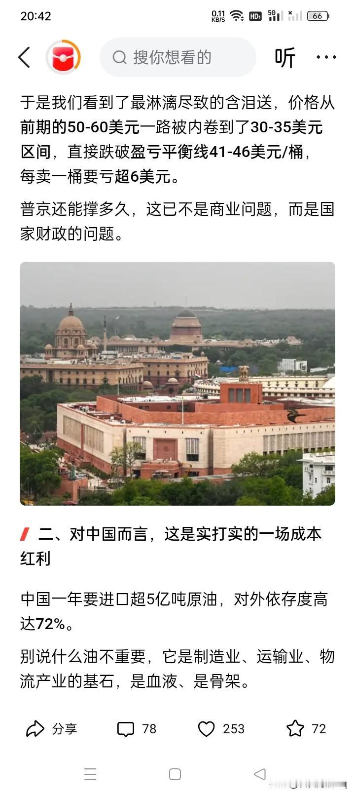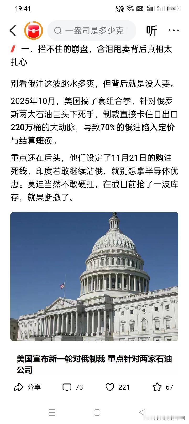 谁赔得起? 谁又能想象得到,俄罗斯乌拉尔原油价格最低已经降到每桶33.17美元,波罗的海地区的售价为34.8美元。而国际市场的布伦特原油价格却仍然在61美元上下徘徊。 在这种情况下,肯定是有人认为,既然俄罗斯的原油这么便宜,可以大量购买、甚至是大批储存。实际上,正是由于存在无法克服、或不容易克服的困难和原因,才导致不能大量购买和储存,才造成俄罗斯原油的价格暴跌。 网络上曾经有消息说,俄罗斯每生产一桶原油的成本在69美元,如果真的是如此,现在俄罗斯每出口一桶原油,就要赔30多美元。那么,俄罗斯在这种入不敷出的情况下,采油企业究竟还能坚持多久呢?当然了,也有消息说,俄罗斯出口石油的盈亏平衡线在41-46美元,即便是如此,每桶也要赔进去6-10美元。 这就关系到俄罗斯与乌克兰的战争,究竟还能坚持多久?对这个问题,我们就不过多去考虑了,因为支持战争和与战争相关的事情很多,单纯从这一点也看不出来个什么。 但是,仍然不能忘记,油气等能源产品的出口,无疑是俄罗斯最重要的收入来源。