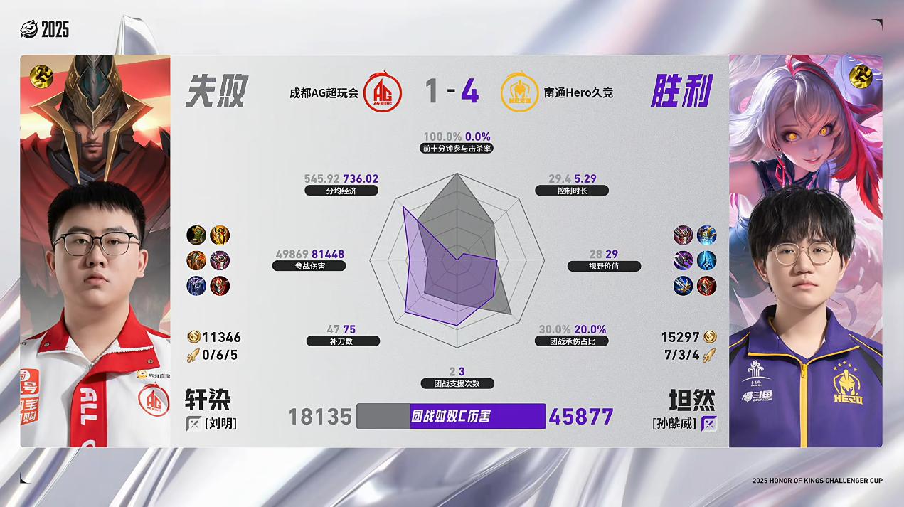 虎扑12月27日讯Hero/AG第5局数据对比:坦然对双C伤害拉满,一诺参战伤害高。