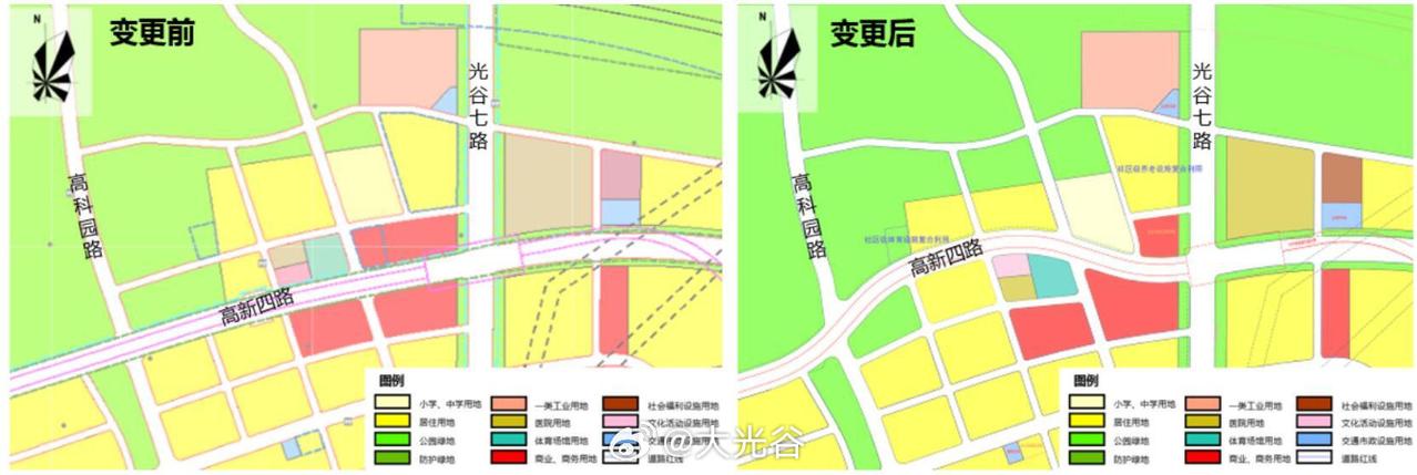 为高新四路贯通,光谷这里用地规划调整! 12月26日,为尽快贯通高新四路,东湖高新技术开发区规划局发布了关于新城组群E0208、E0209编制单元局部用地控制性详细规划导则变更论证可行性必要性征求意见的公示。 将高新四路沿线商业服务业用地减少约0.90公顷,公共管理与公共服务用地增加约0.35公顷、城市道路用地增加约0.55公顷,其他用地及设施规模不变,公示时间:2025年12月26日-2026年1月4日。