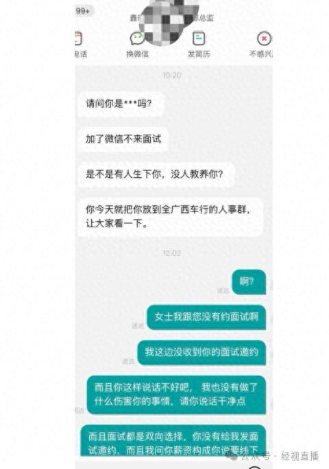 据经视直播报道,12月24日,有网友发文称,自己向南宁一家汽车公司投递简历后,因未前往参加面试,竟遭到公司人事辱骂。