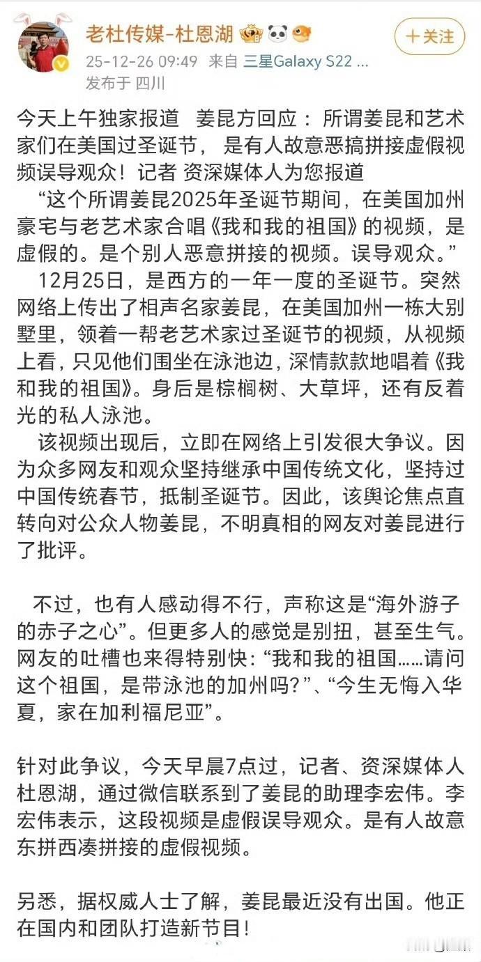 “我是谁?我从哪里来?我要到哪里去?”姜昆助理说,姜昆在国内,视频也是在国内拍的。 这个自称视频拍摄者说,是在洛杉矶的朋友家拍的。 请问姜昆到底在哪里? 我们该相信谁?到底有几个姜昆? 要明确姜昆的真实所在地,还需要更多的证据来核实,比如姜昆本人的说明、更确切的行程记录等,才能厘清事实真相。