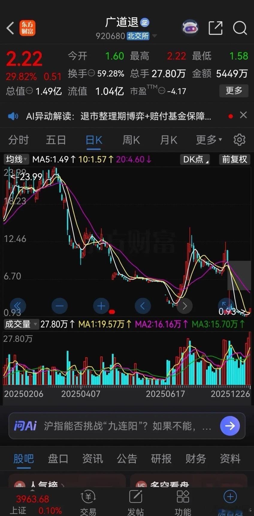 疯了,真疯了!还有三天退市,股价却连续拉出3个30CM涨停。炒了十几年的股票,第一次见到这么疯狂的场面,剧本都不敢这么演!进入退市整理期的广道数字,股价连续一路大跌,本周三最低跌到了0.93元,本以为就这样退市了,没想到当天突然暴力拉升,强势30厘米涨停,周四接着30厘米涨停,昨天是周五再次30厘米涨停。连续拉出3个30厘米涨停,从最低0.93元涨到了周五的最高2.22元,涨幅139%。关键是公司还有三天就要退市,却连拉3个30厘米涨停,翻倍还多,谁能告诉我,这到底是什么原因?