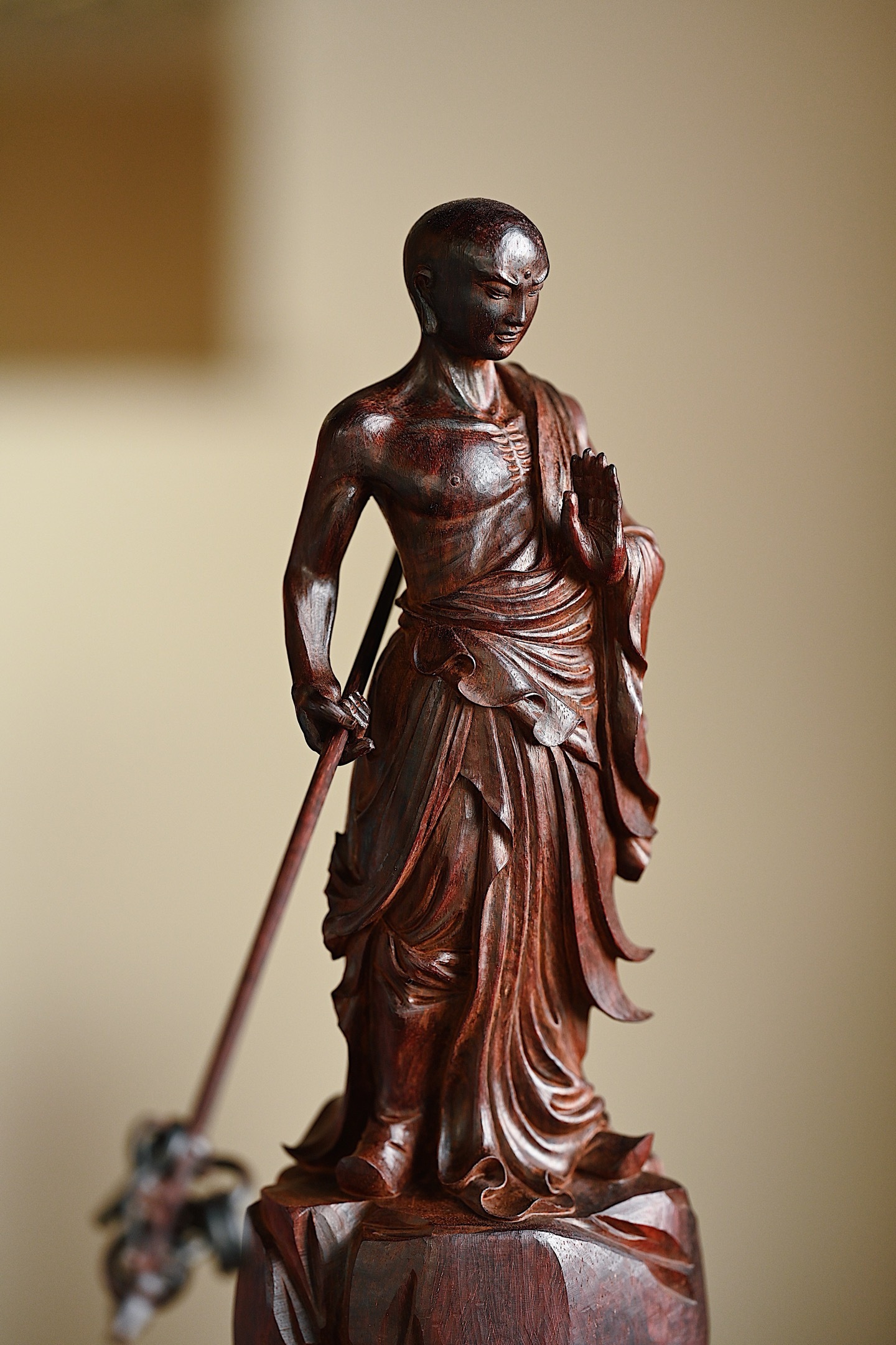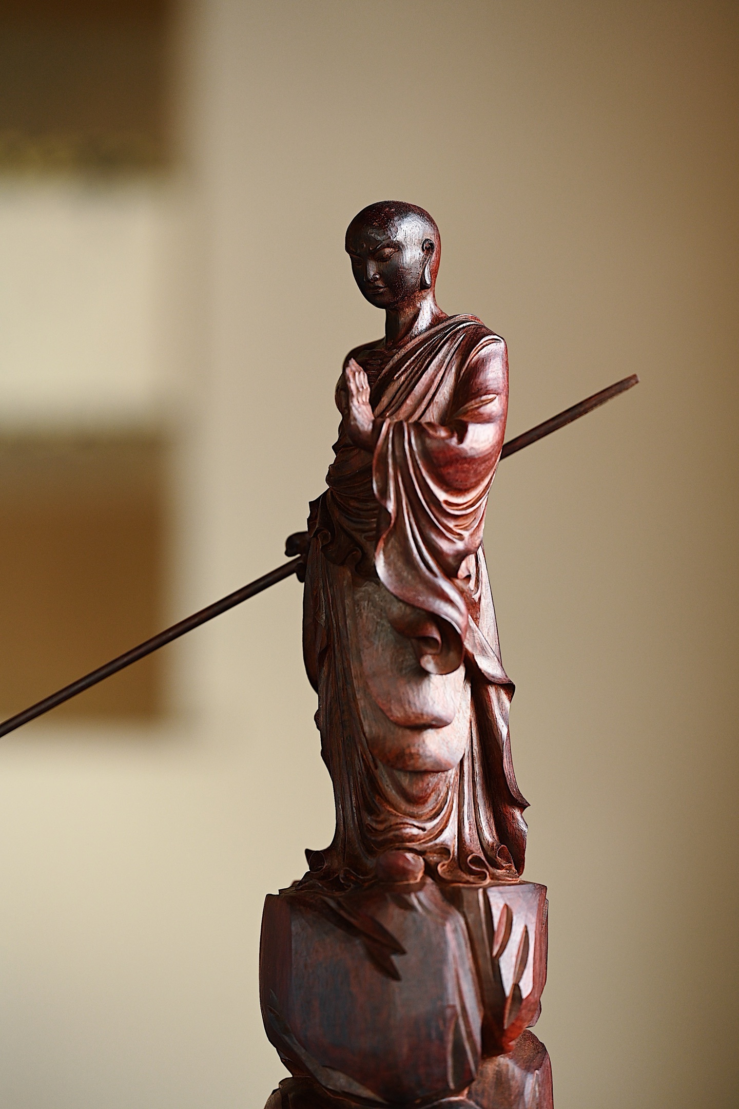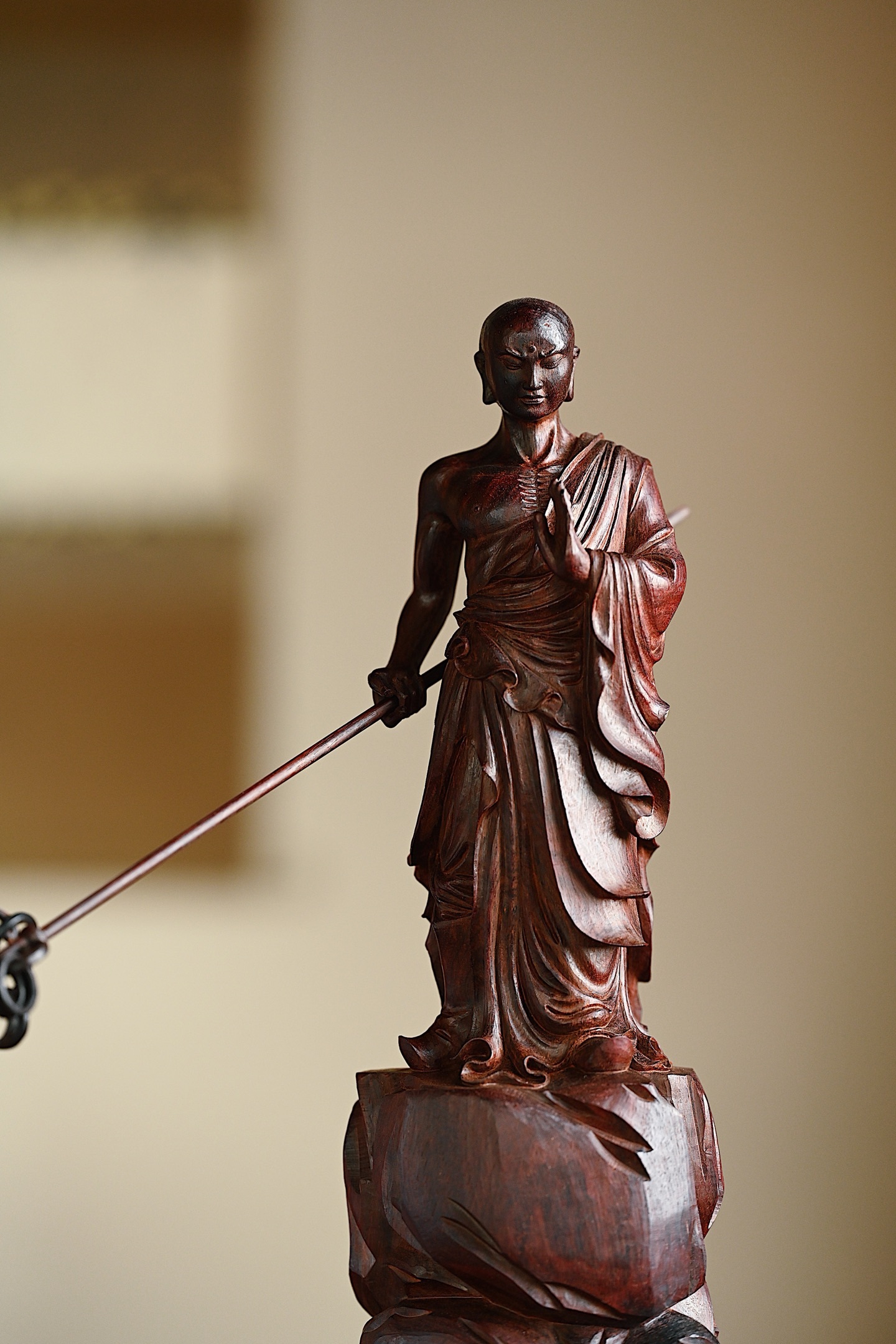小叶紫檀 | 地藏王法相慈祥庄严,面容宁静智慧,身着袈裟,法体金彩为饰,左手托宝