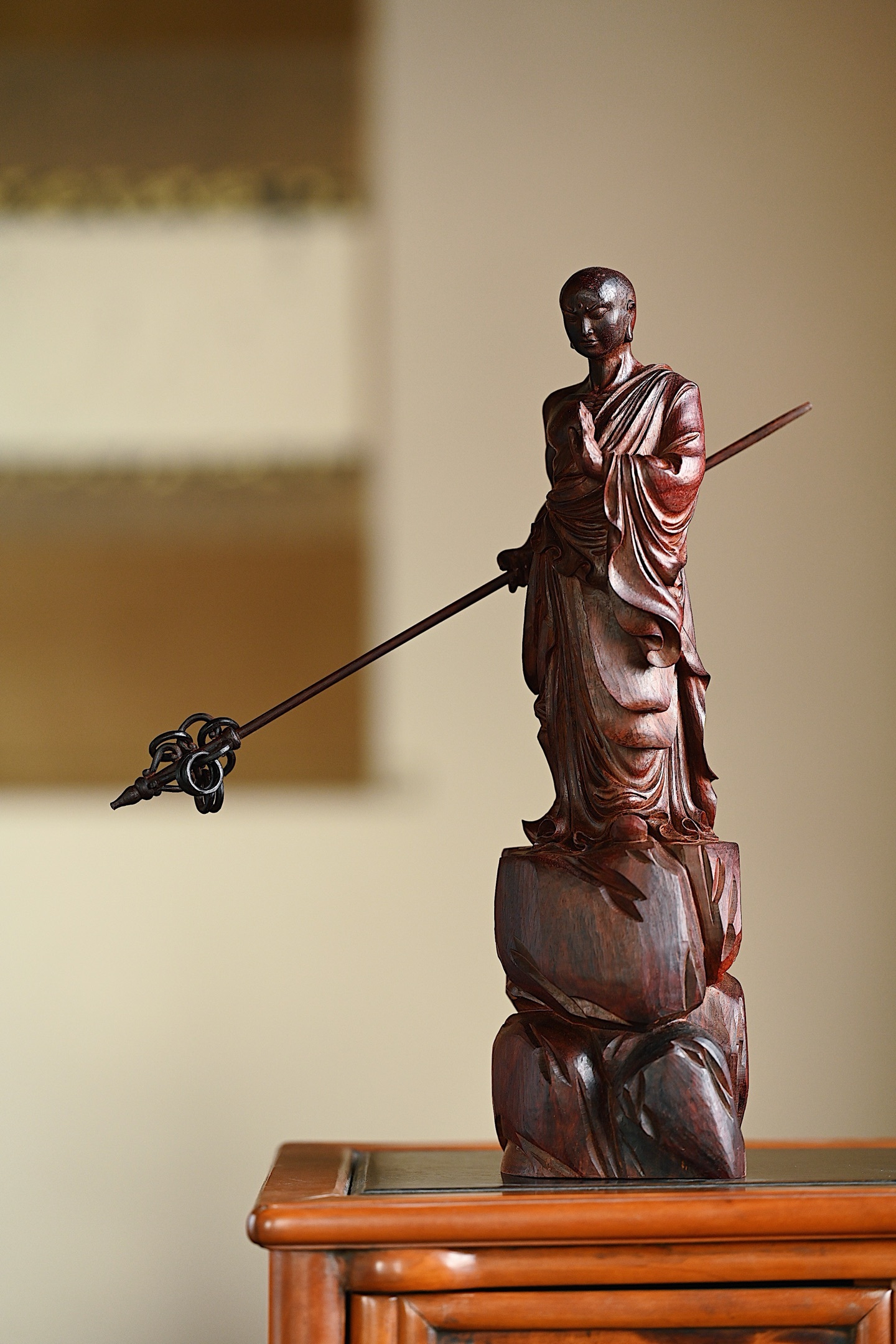 小叶紫檀 | 地藏王法相慈祥庄严,面容宁静智慧,身着袈裟,法体金彩为饰,左手托宝珠,右手执锡杖,雕琢精细,线条流畅,殊胜吉祥。整体10*7.5*29cm 817g权杖长26.8cm